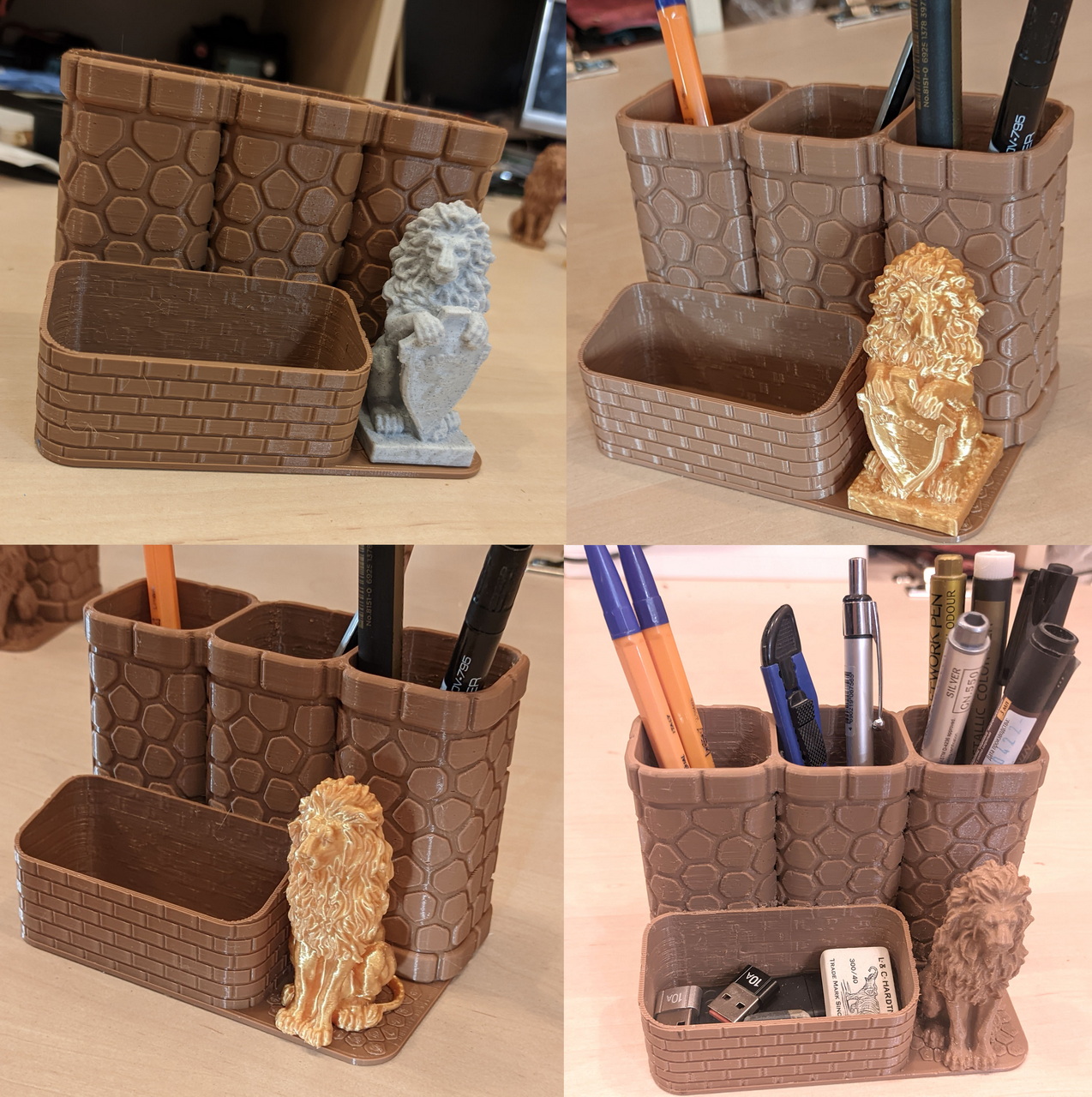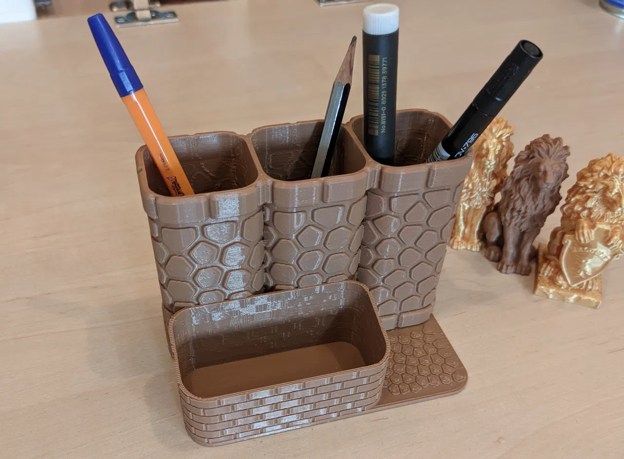 Chỗ cắm bút này có bệ "đá" để bạn đặt tượng, hiệp sĩ, batman hay bất cứ thứ gì. Kích thước bệ 40x40 mm. In lớp 0.2 mm không cần support.
