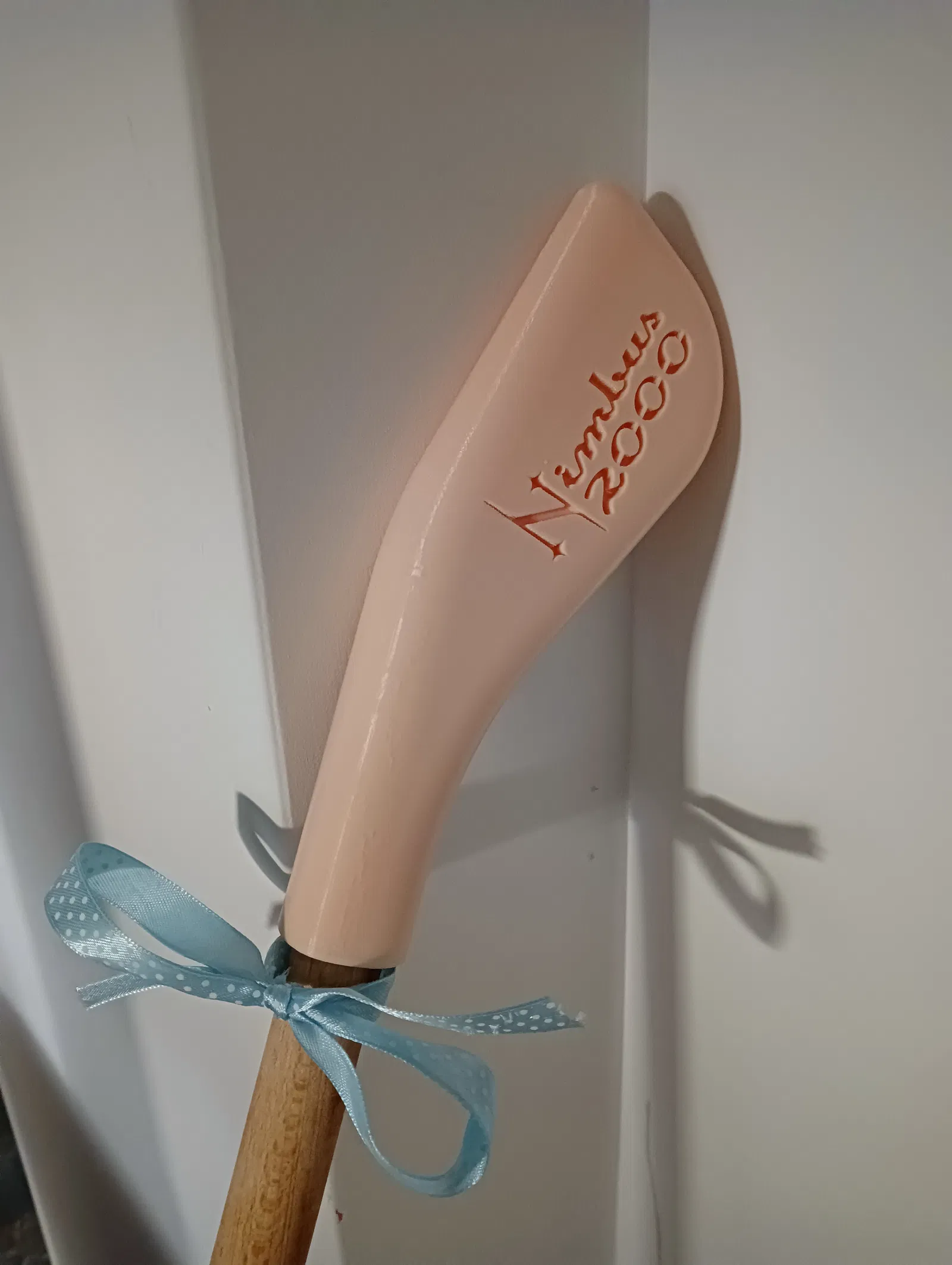 Chui đèn với bảng hiệu "Nimbus 2000". Đường kính cán chổi khoảng 20-21 mm. Bạn có thể điều chỉnh kích thước toàn bộ mô hình cho phù hợp.