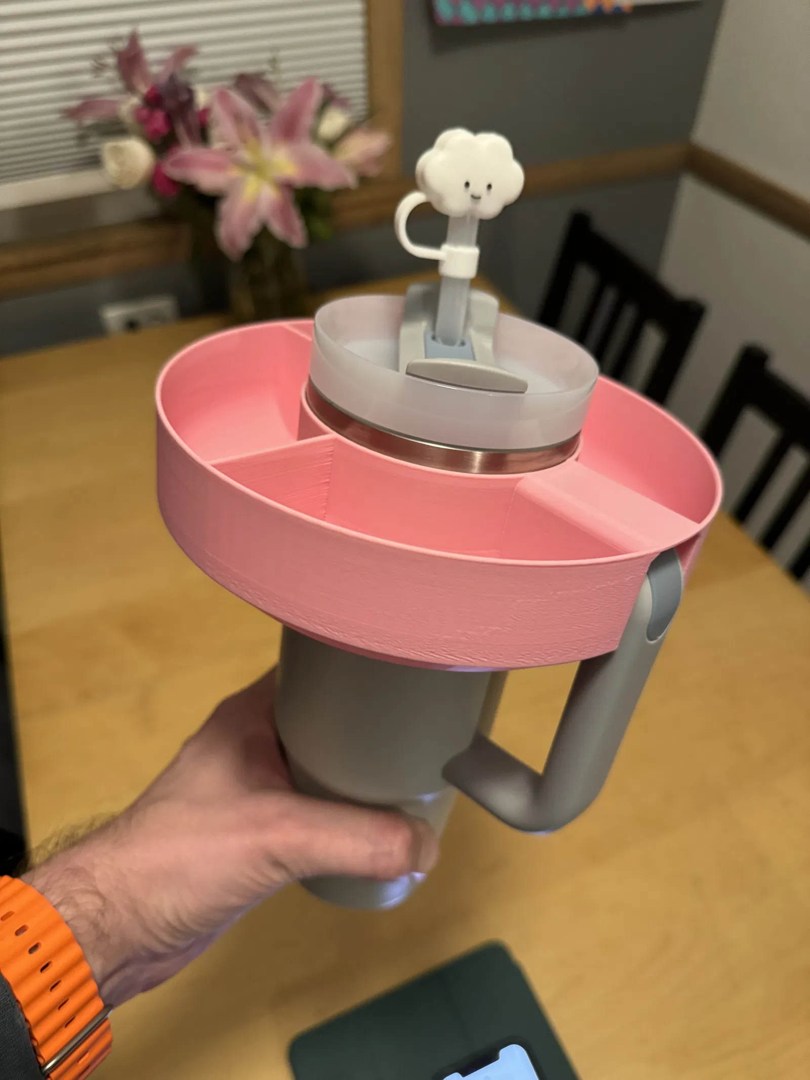 Một khay đựng đồ ăn vặt đơn giản, vừa vặn đặt trên miệng Cốc Stanley Quencher (30oz).