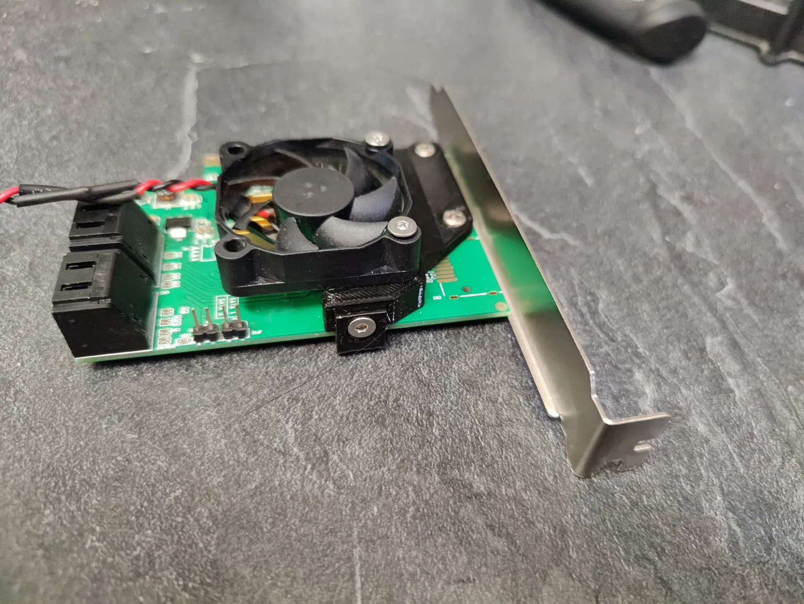 Cái đế quạt này gắn cho card Delock SATA. Card của tui bị nóng quá lúc xài nhiều I/O nên tui tạo ra cái này để gắn quạt vô cho mát. Phần đế gắn bằng ốc vỏ card, phần kẹp thì dùng ốc M3.