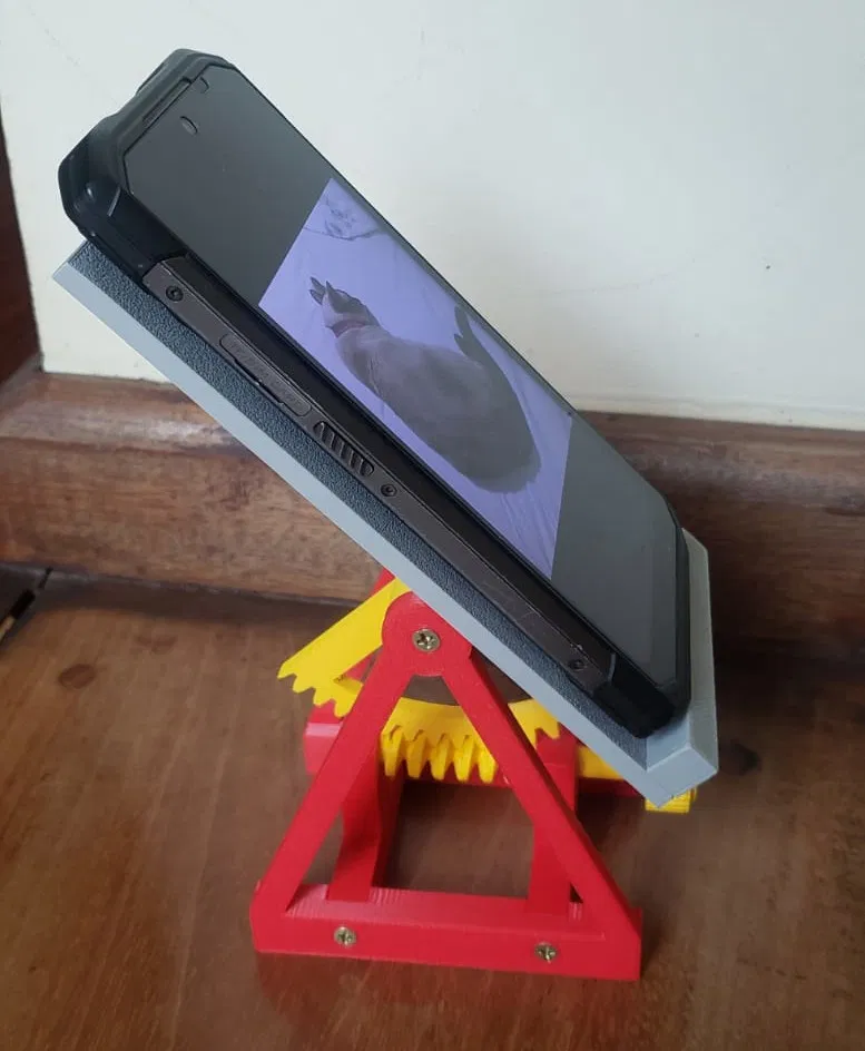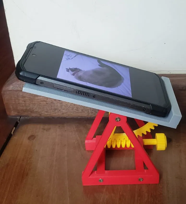 Dễ dàng in và dễ sử dụng chân đế điện thoại. Có thể điều chỉnh bằng cách xoay núm vặn để xoay bánh răng sâu. Phần bàn cho điện thoại có thể tháo rời, giúp bạn tùy chỉnh theo ý thích. Tốt nhất in bằng PLA.