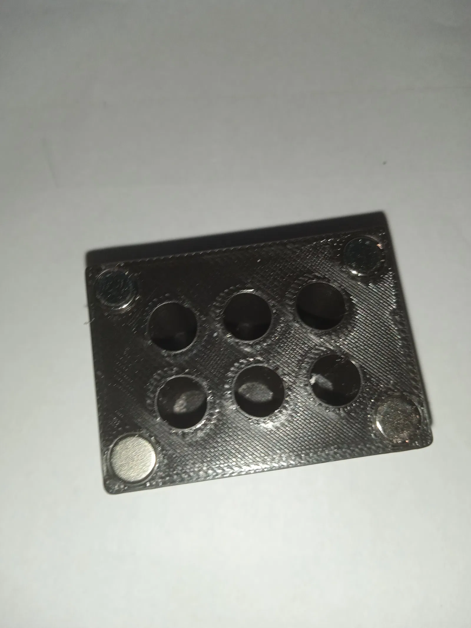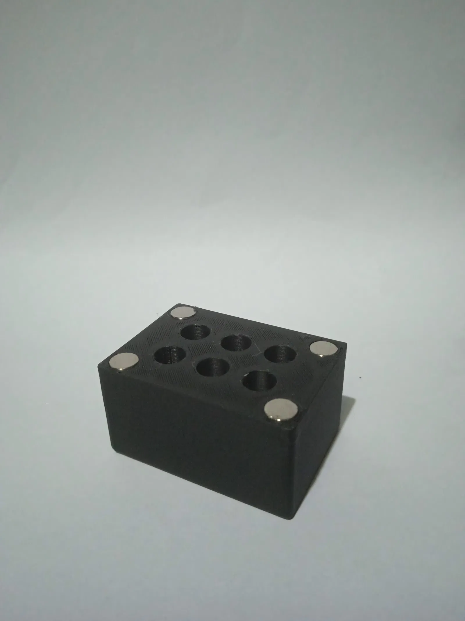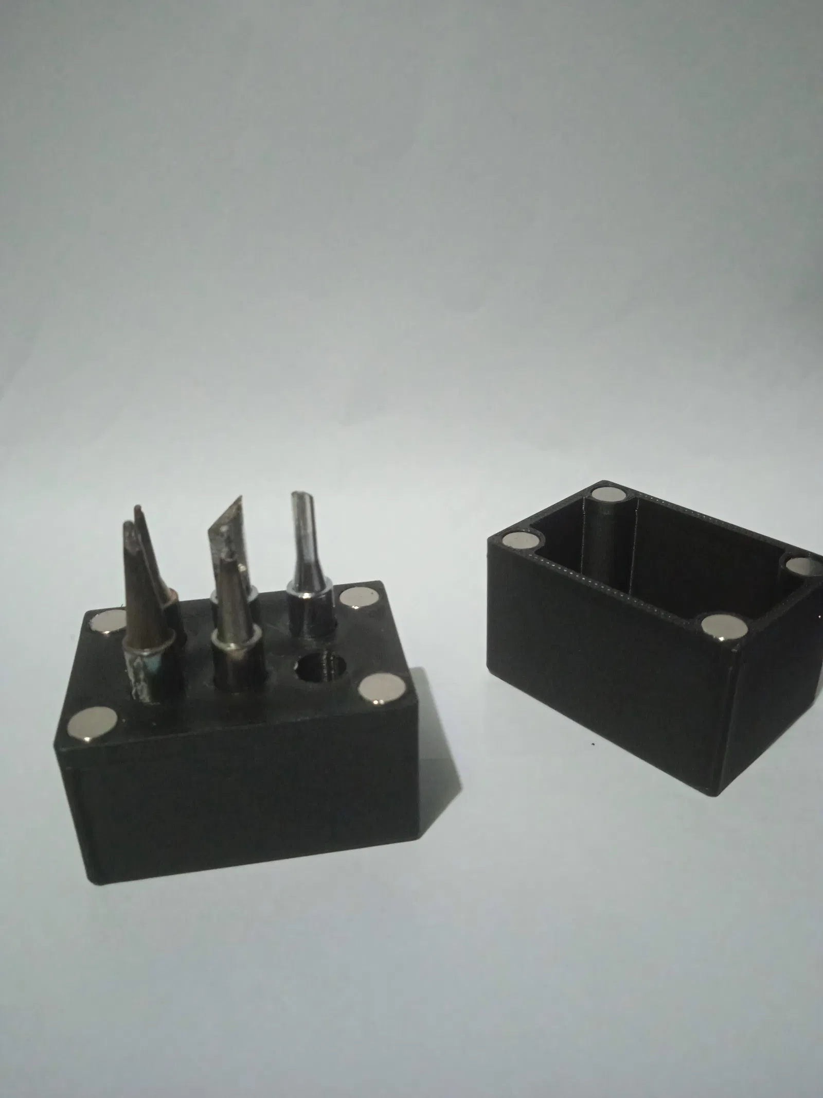 Đây là một hộp đựng mấu hàn nam châm đơn giản, chỉ cần 8 viên nam châm 6x3 gắn vào là được. Nó có thể chứa 6 mấu hàn có đường kính từ 6mm đến 6.4mm vì đây là kích thước tiêu chuẩn.