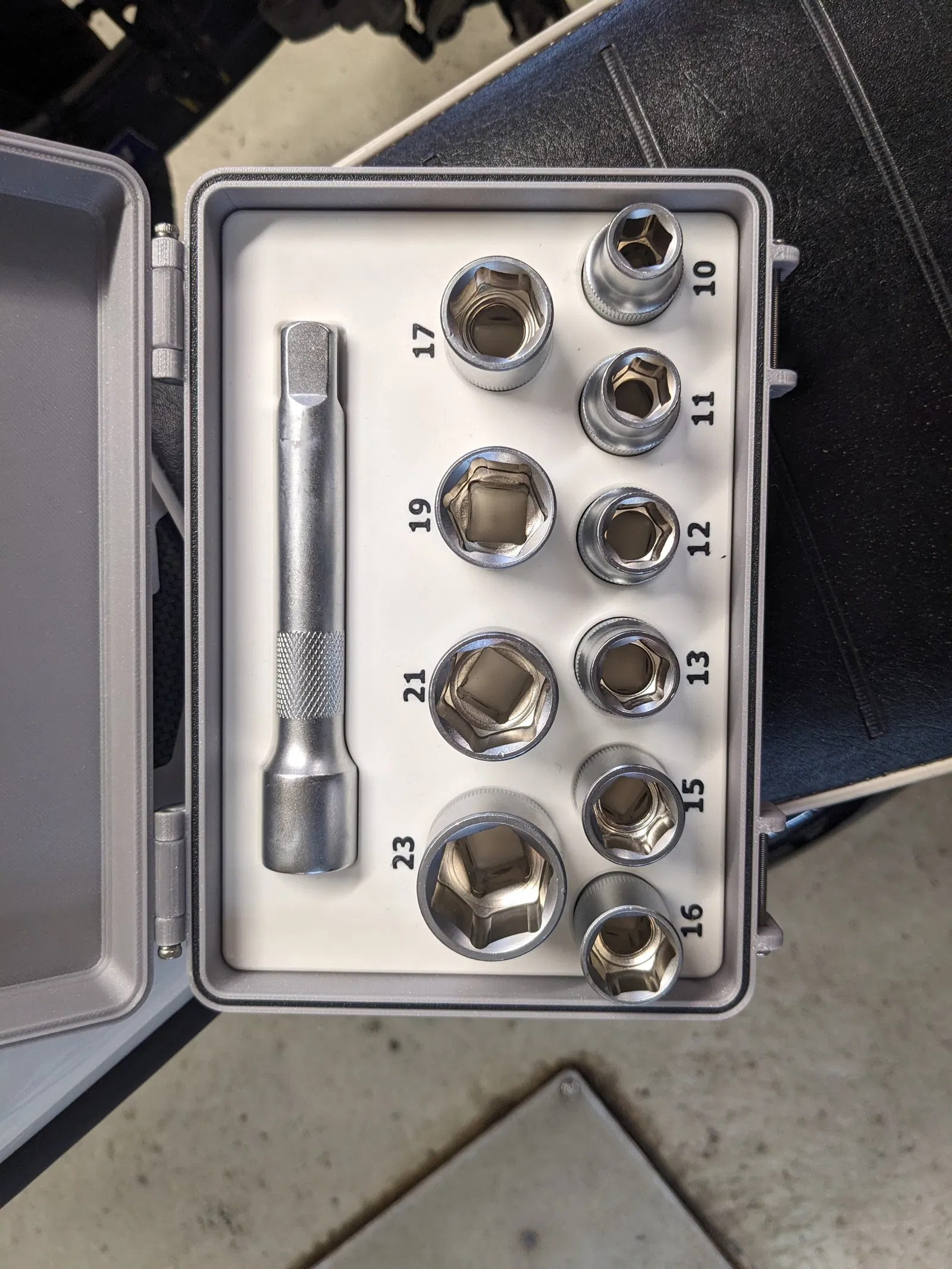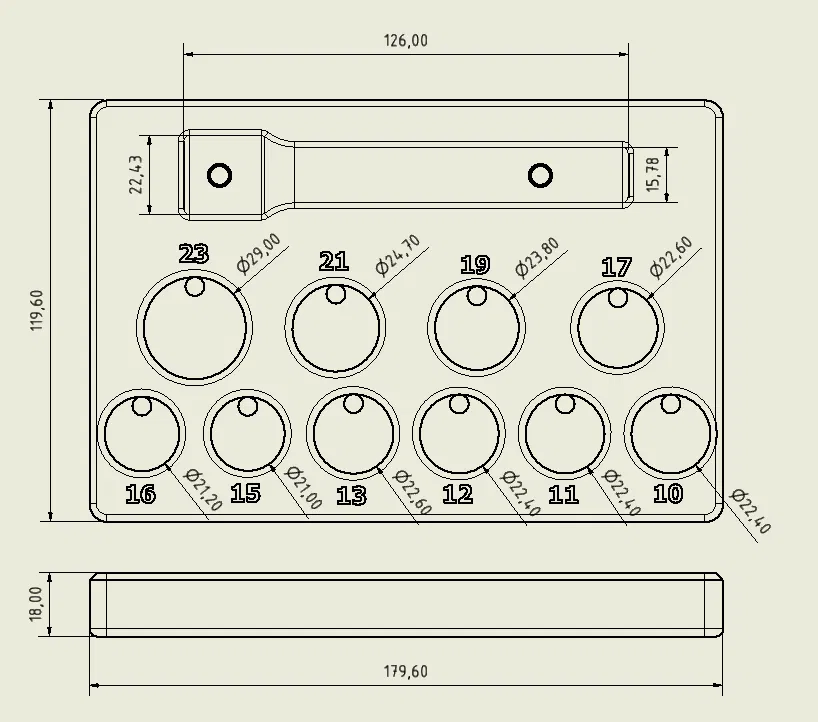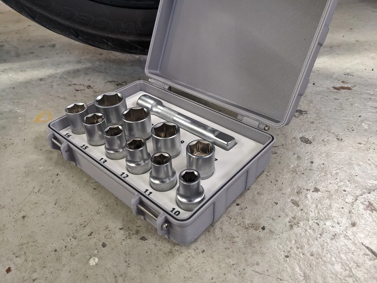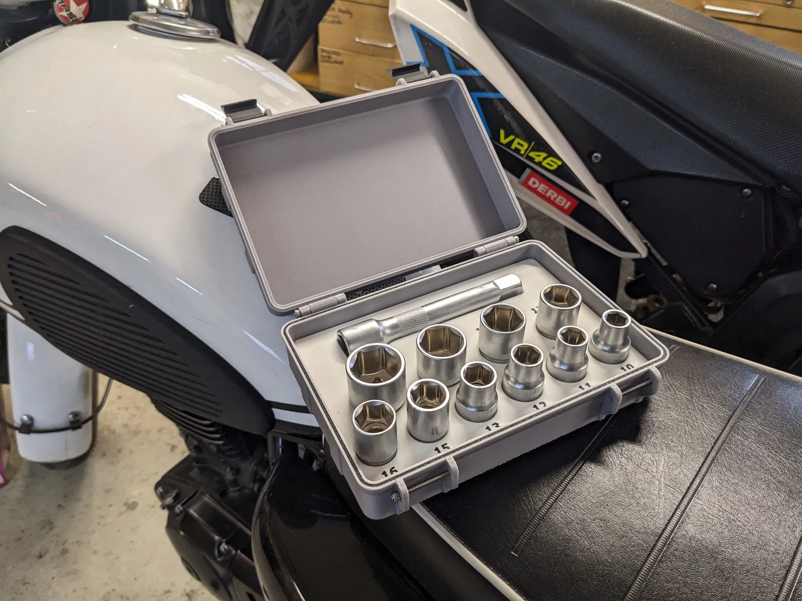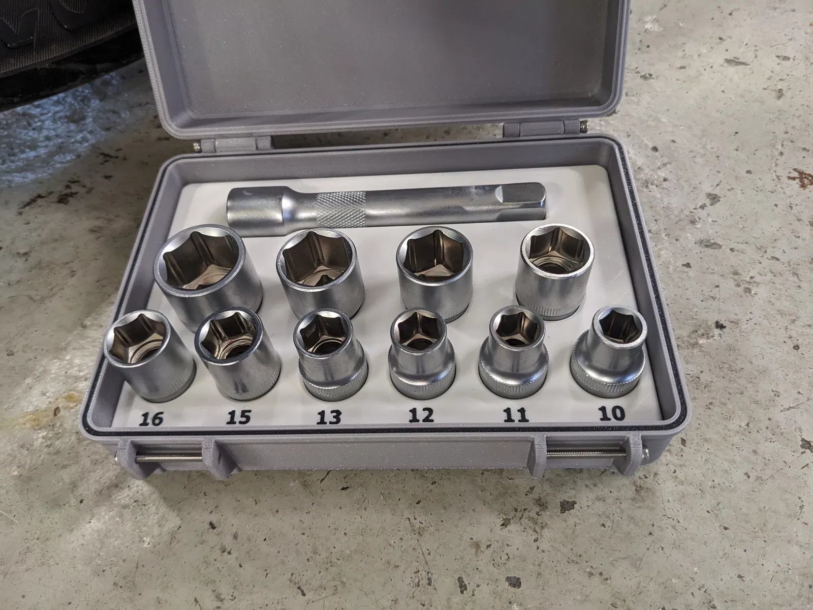 Đây là một bộ chèn cho Rugged Box (Parametric) của Whity Bộ chèn này được thiết kế cho bộ tuýp 12 món của Werckmann nhưng các loại tuýp khác cũng có thể dùng được. Nhớ xem kỹ kích thước trước khi in nha. Chiều cao tuýp tối đa 46mm. Bên trong hộp 180x120x50 mm #### Bộ phận để lắp ráp: * 6 con vít M3x30mm