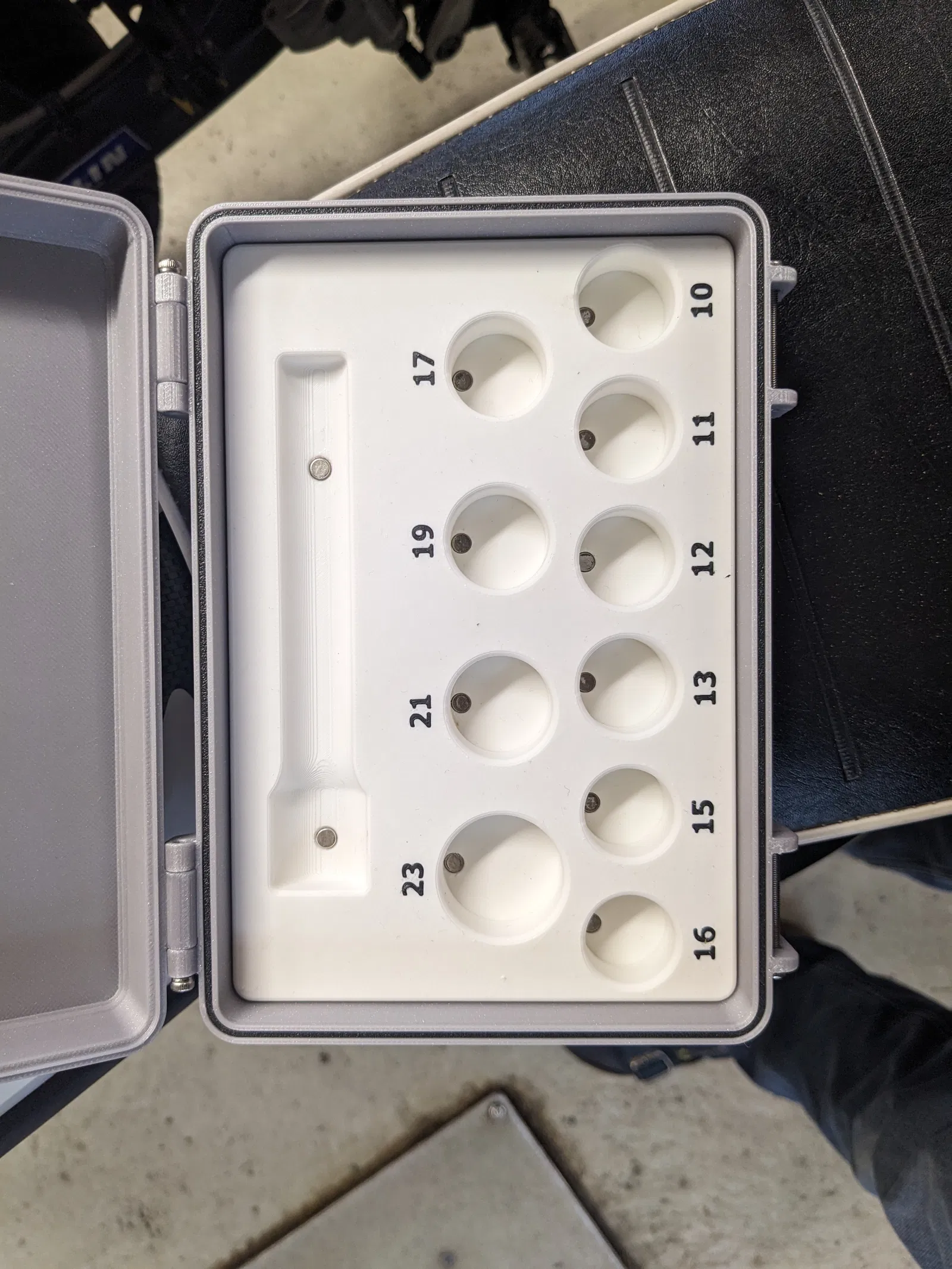 Hộp đựng vừa 10 tuýp và 1 tay nối. Bộ chèn này thiết kế riêng cho Rugged Box Parametric, bạn có thể gắn thêm nam châm để cố định. Chiều cao tuýp tối đa 46mm, kích thước bên trong hộp là 180x120x50mm.