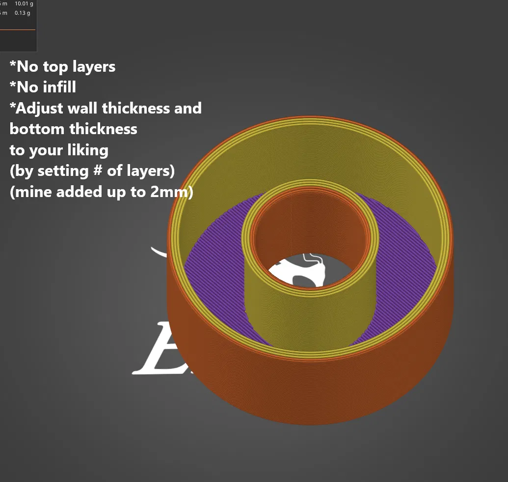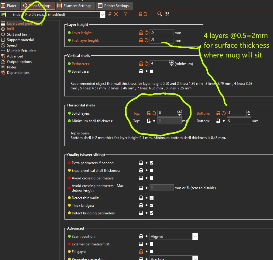 Lớp trên cùng với độ dày thành của tui cộng lại là 2mm (cho nên tùy thuộc vô cái máy in của mấy ông, chiều cao lớp in với độ rộng đường in mà chỉnh cho nó hợp lý khi in nha; miễn sao cộng lại ít nhất cũng được 2mm là ok);