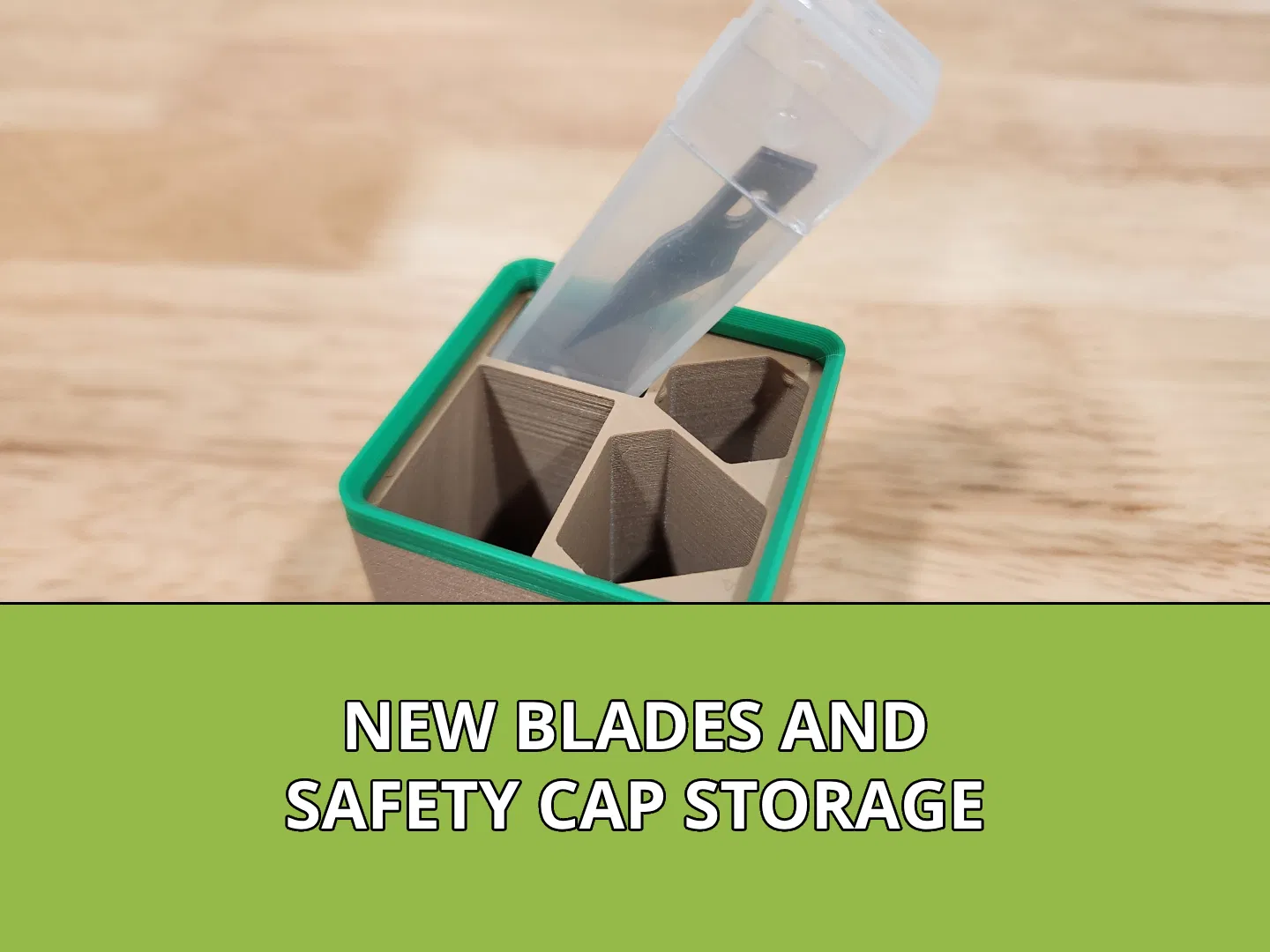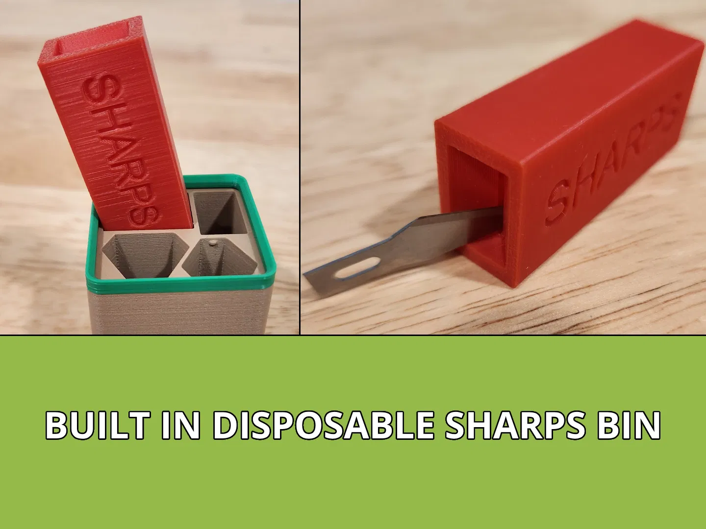 - Một hộp đựng dao lam đã qua sử dụng tùy chỉnh được cất giữ trong bin cùng với dao để xử lý an toàn các lưỡi dao bị cùn. Khi bin đầy, bạn có thể vứt bỏ và in một chiếc mới để thay thế.
