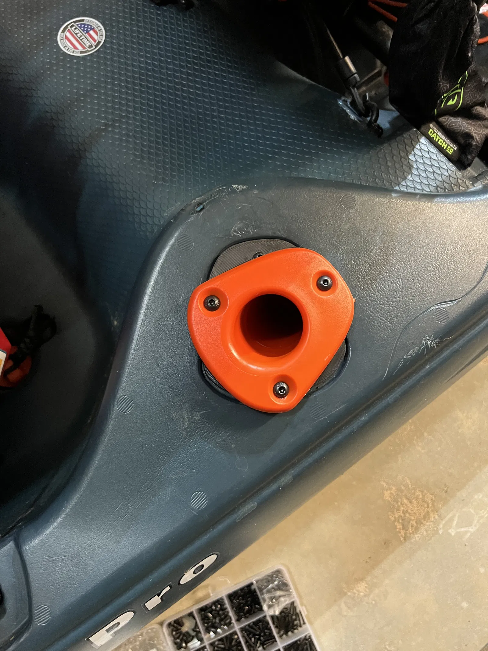Tôi đã tạo ra cái pát này cho chỗ cắm cần câu trên chiếc Lifetime Teton Pro của mình, sau khi lấy ý tưởng từ một người bạn cùng chơi kayak trên nhóm FB. Cái này dùng để xoay cần câu của bạn cho nó nằm dọc theo thân thuyền kayak thay vì cắm ngang ra hai bên.