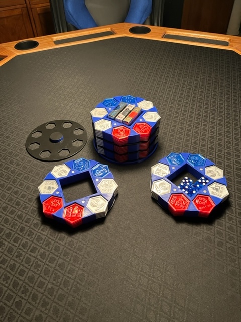 - Khay xếp chồng, kết nối bằng nam châm và nắp đậy, khi lắp ráp lại sẽ tạo ra các ngăn để chứa 3 bộ bài và một bộ xúc xắc.