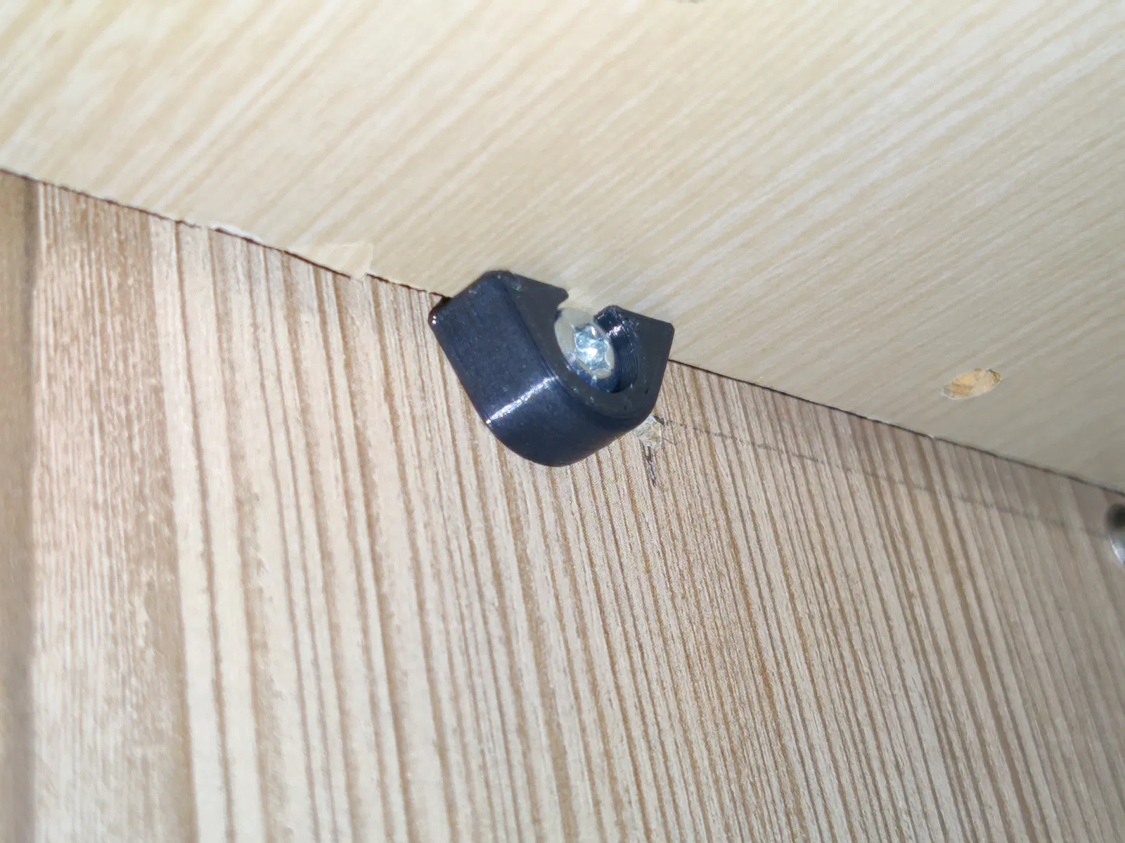 Chúng tôi đã từng gắn một cái bằng đinh (ở hình thứ hai) nhưng nó cứ bị rớt ra hoài à. Cái này thì chắc chắn, vặn thẳng vô gỗ luôn. Nó có cùng khoảng cách (4mm) từ tâm lỗ đến kệ nên có thể dùng như một cái thay thế trực tiếp, tận dụng lỗ cũ của cái đinh để làm dẫn hướng cho con vít.