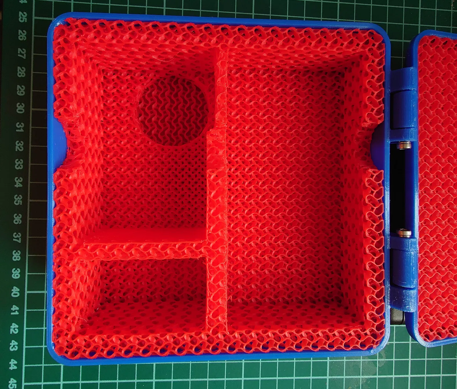 Chiếc hộp in này sử dụng rất nhiều vật liệu: vỏ và chốt bằng PETG, lớp lót bằng TPU, vật liệu hỗ trợ bằng PLA. Cụ thể, lớp lót được in từ TPE88 siêu mềm của Filament PM.