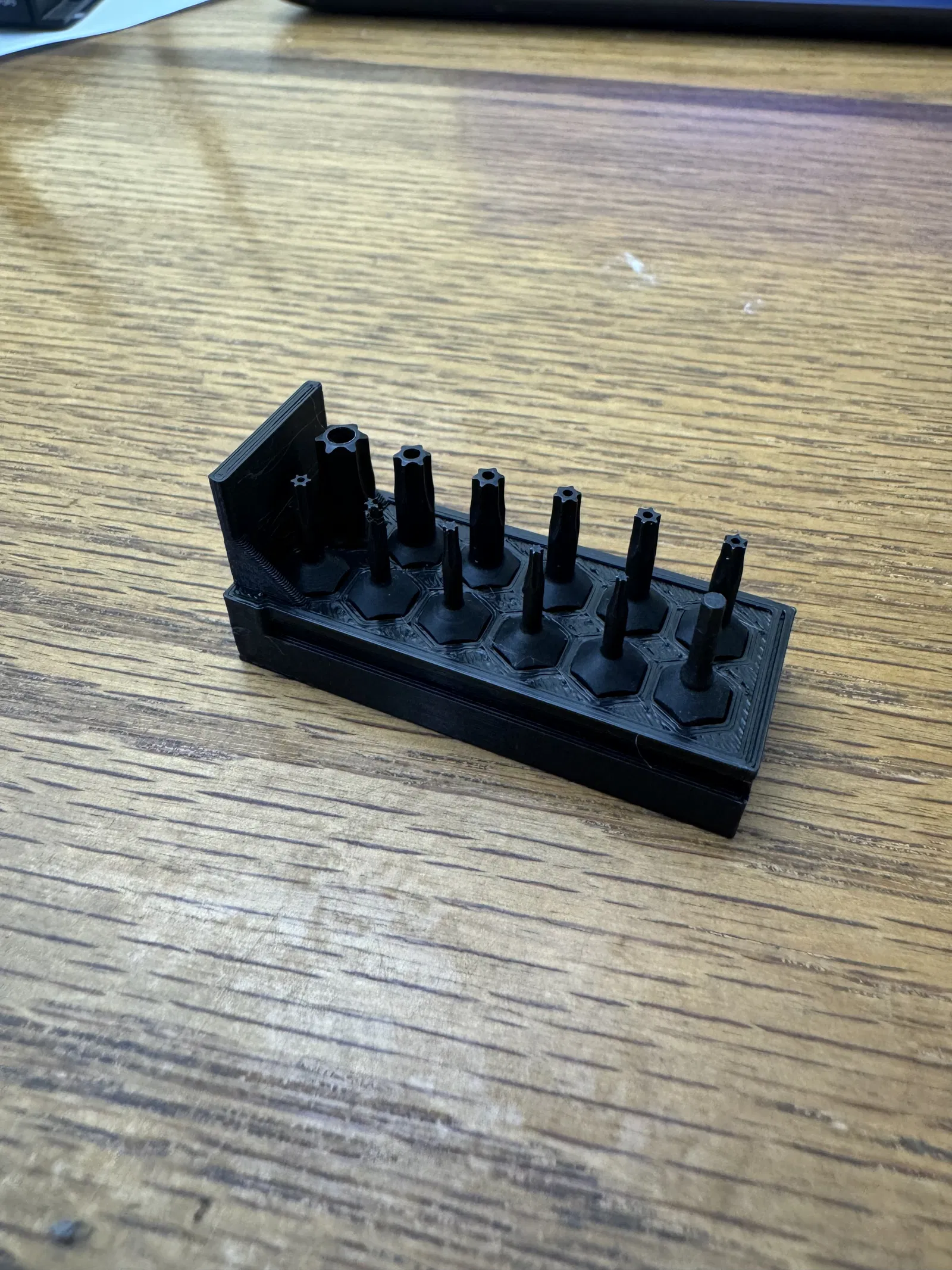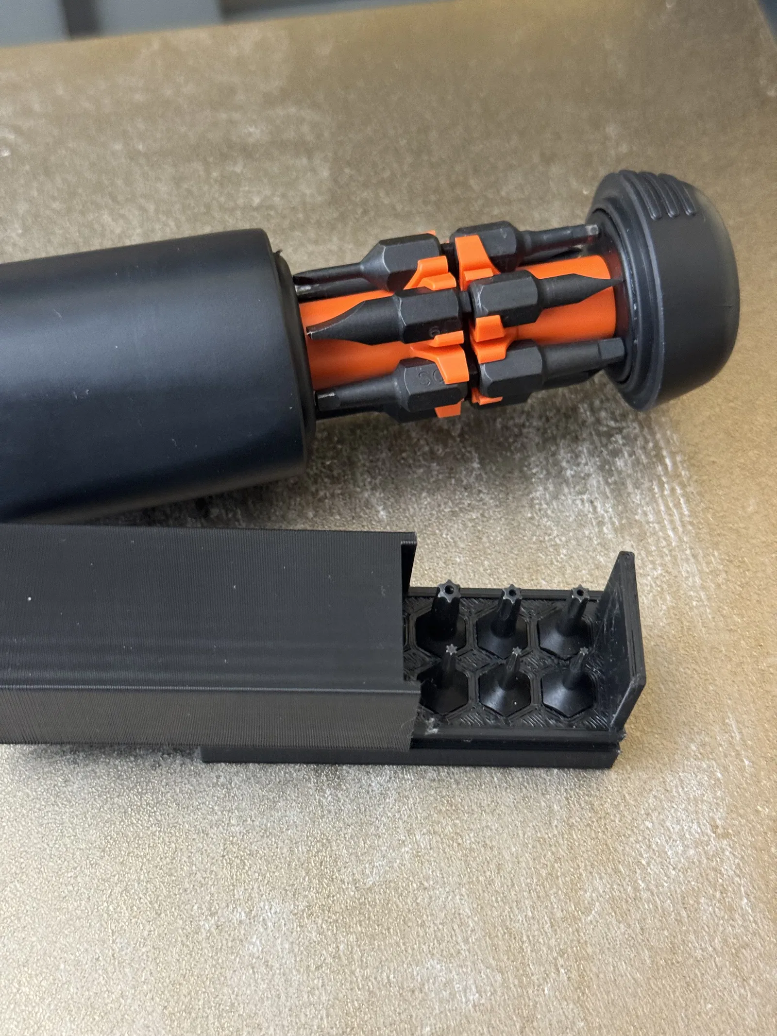 Hộp đựng mũi vặn vít nhỏ gọn, in 3D hoàn toàn, chứa trọn bộ 12 mũi. Thiết kế khít để bỏ chung túi với tuốc nơ vít. Phiên bản V2 có gia cố thêm để tăng độ bền.
