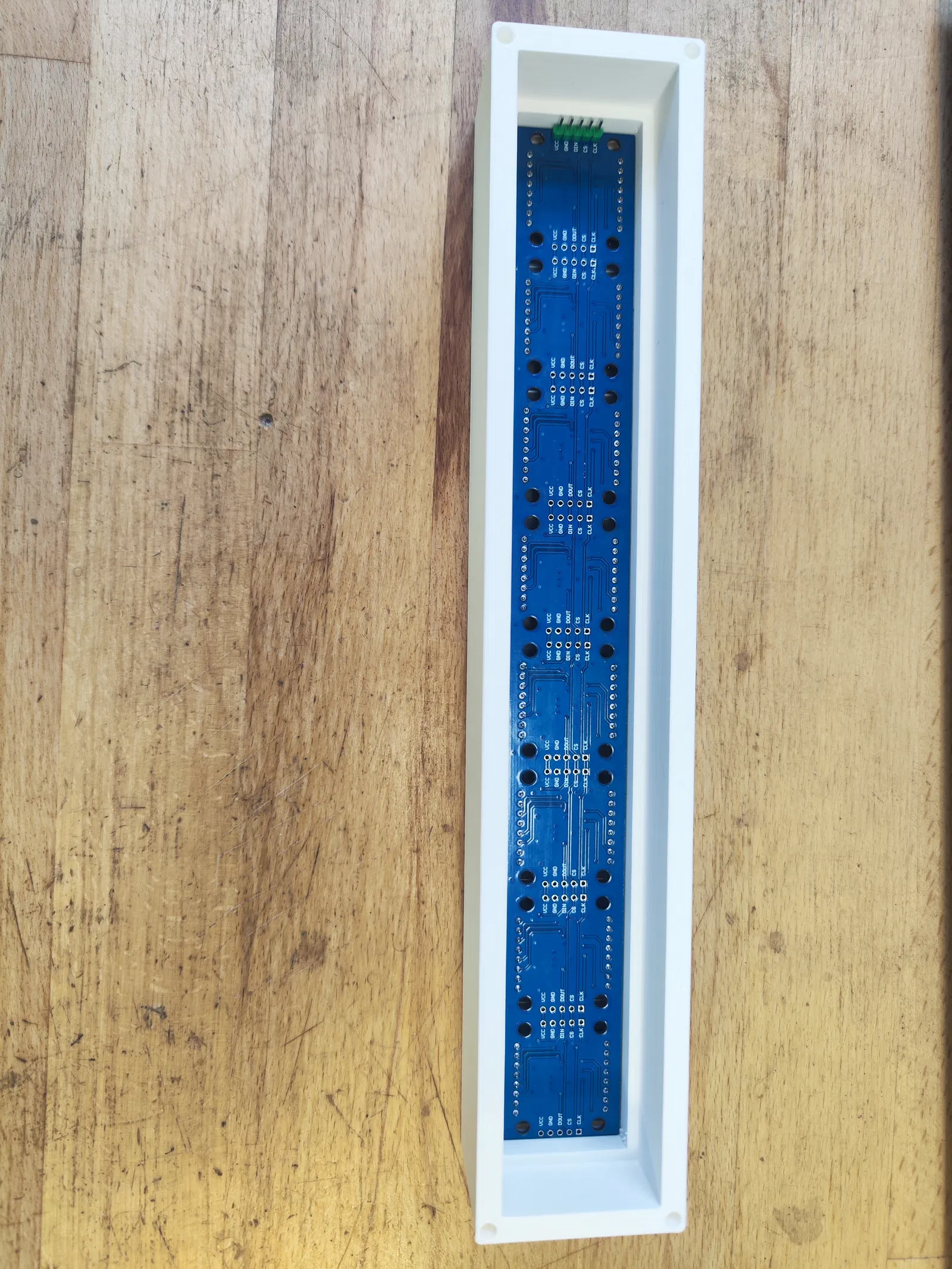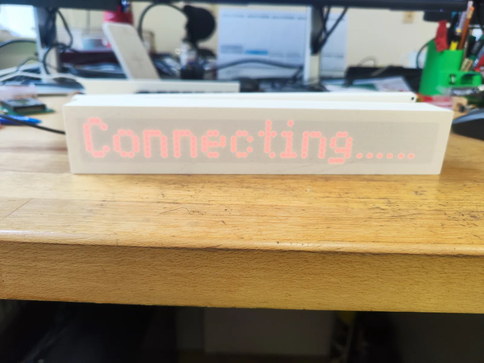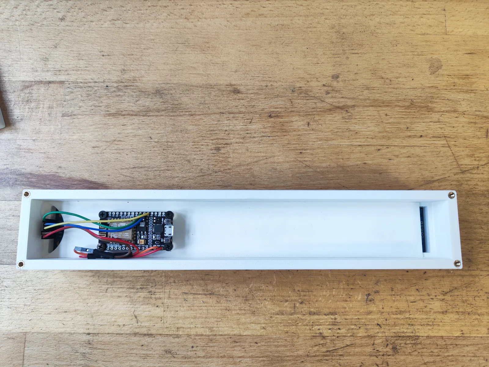 Vỏ case dùng để đựng mạch led matrix MAX7219 64x8 và ESP8266. Vỏ có thể treo tường hoặc để bàn, được cố định bằng 4 ốc M3. Thiết kế yêu cầu 8 ren cấy M3, in bằng PLA với lớp đầu 0.2mm và mật độ ruột 10%.