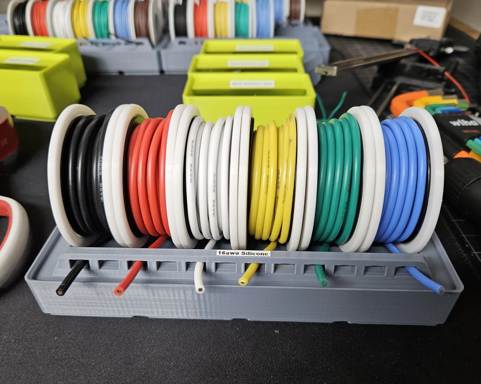 Cải tiến giá đỡ cuộn dây Gridfinity cho các loại dây lớn hơn (16awg+). Phiên bản mới có khe rộng và sâu hơn, lỗ luồn dây lớn hơn, giúp sắp xếp cuộn dây đường kính ~71mm dễ dàng. Phiên bản 2x5 còn tăng chiều rộng cho nhiều cuộn hơn.