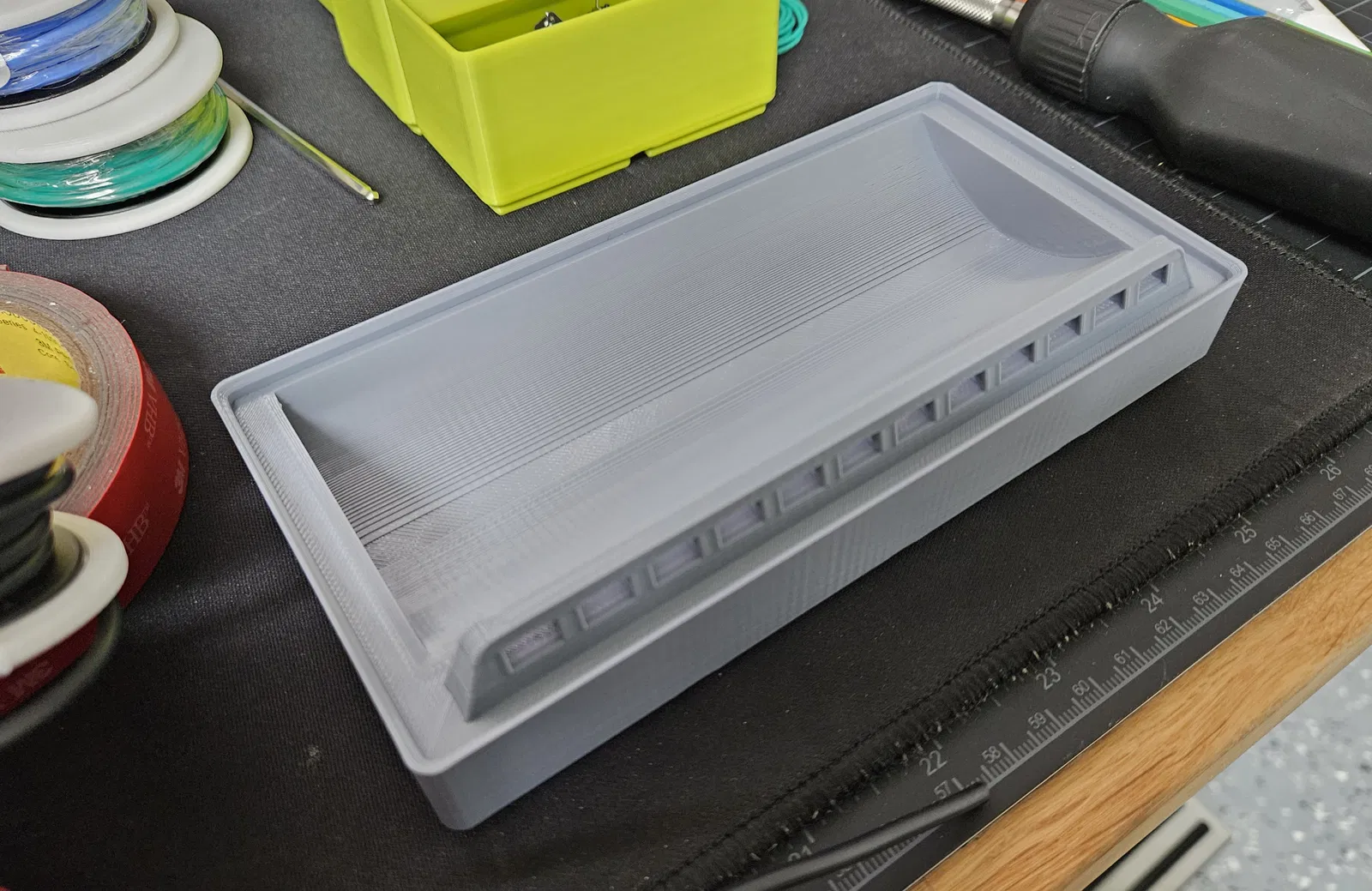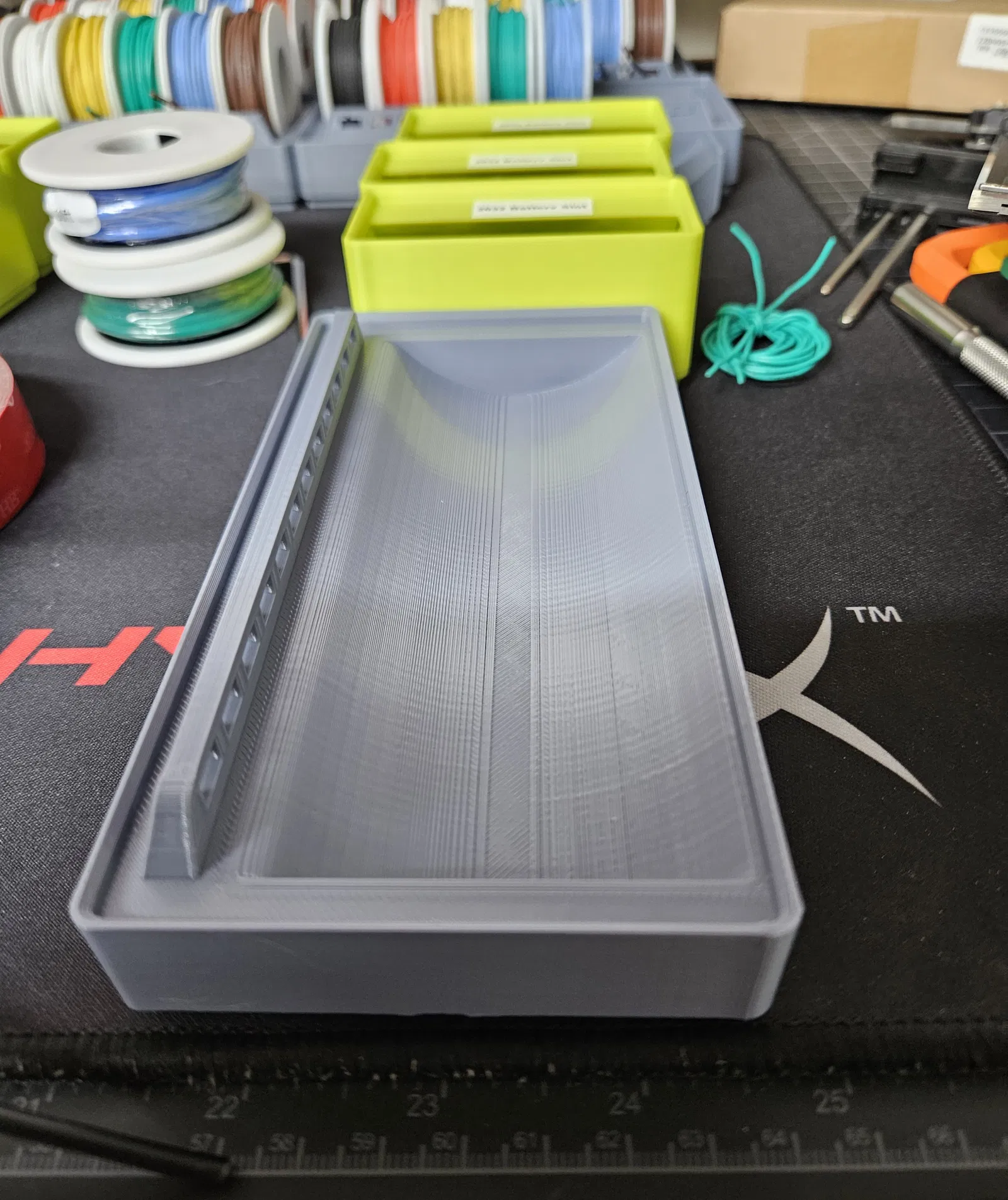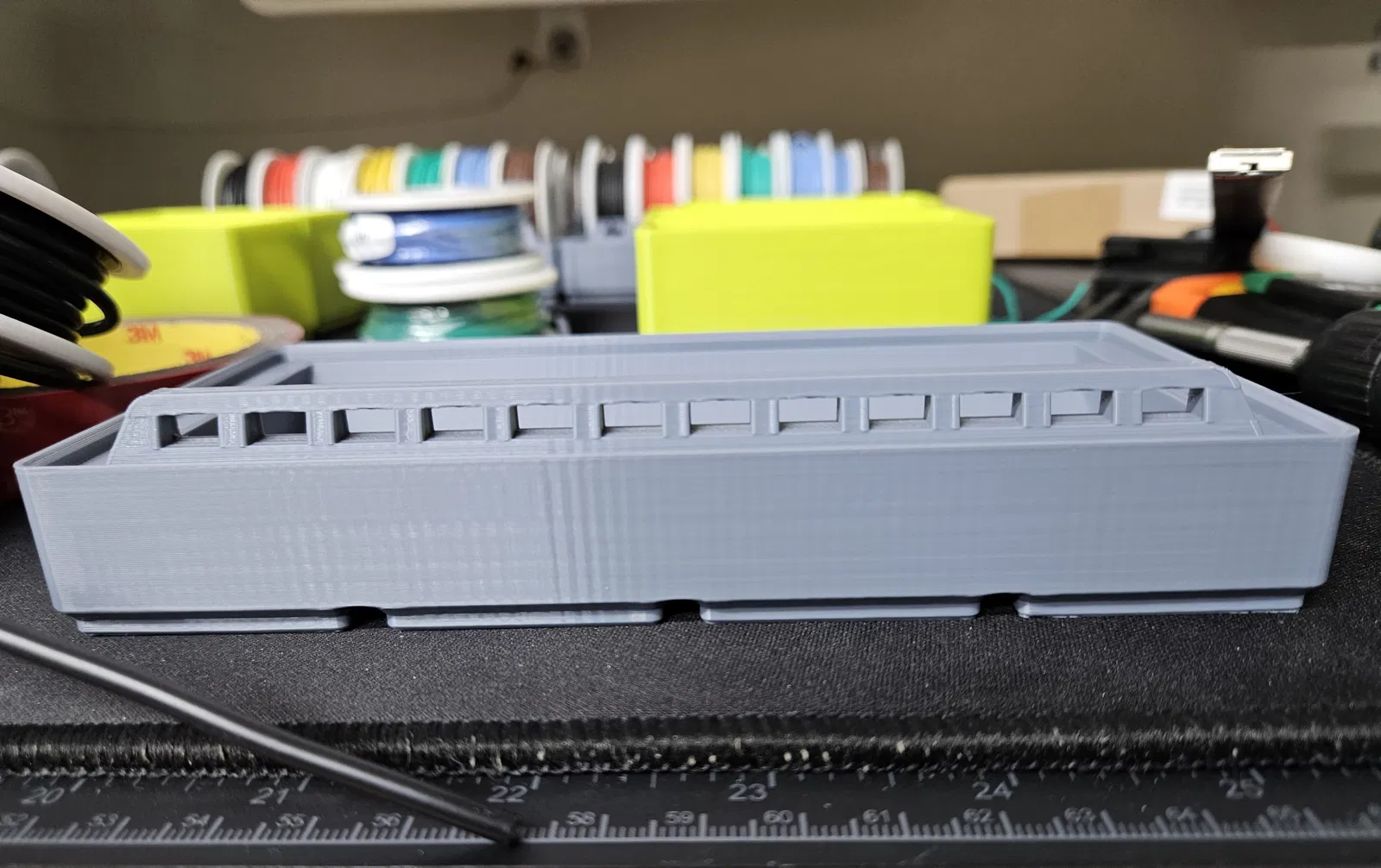 Bản remix này giúp sắp xếp các cuộn dây có đường kính khoảng 71mm với dây loại 16awg, 14awg và 12awg dễ dàng hơn. Thiết kế gốc đã rất tuyệt vời, tuy nhiên việc luồn dây loại lớn hơn qua các lỗ dẫn dây và xếp được 6+ cuộn dây cạnh nhau (và tất cả các cuộn đều nằm sát đáy một cách chính xác) trở nên khó khăn hoặc không thể. Thiết kế này cải thiện khả năng sử dụng của thiết kế gốc cho các cuộn dây lớn hơn bằng cách tăng bán kính và độ sâu của khe bo tròn. Khe bo tròn giờ đây sâu 15mm theo trục z và dài 60mm từ trước ra sau đối với phiên bản 2x4 (với chiều rộng khe ~150mm như cũ). Phiên bản 2x5 lớn hơn là một sự thay đổi triệt để hơn so với thiết kế gốc, chiếm nhiều không gian lưới hơn để tạo ra chiều rộng lớn hơn cho nhiều cuộn dây hơn (bản gốc có khe cuộn rộng ~150mm, bản 2x5 có 194mm). Phiên bản 2x5 cũng có các lỗ lớn hơn (và nhiều hơn do chiều rộng tăng lên) để luồn dây dễ dàng hơn. Cả hai phiên bản đều đi theo con đường tương tự như bản remix của greenbigfrog và sử dụng ít lỗ nam châm hơn nói chung, bởi vì trọng lượng của dây khi được thêm vào sẽ giảm bớt nhu cầu sử dụng tất cả các nam châm có thể để giữ mô hình cố định trên lưới Gridfinity. Kết hợp thiết kế này với thiết kế gốc, bạn có thể sắp xếp dễ dàng hơn các loại dây có nhiều kích cỡ khác nhau. Xin gửi lời cảm ơn lớn đến KellyEgangreenbigfrog về thiết kế và nguồn cảm hứng, cũng như Zack Freedman vì đã tạo ra Gridfinity. :) File này là bản remix của thiết kế tuyệt vời từ User KellyEgan. https://www.f3d.vn/profile/kellyegan File này cũng lấy cảm hứng từ bản remix của thiết kế gốc của User greenbigfrog. https://www.f3d.vn/profile/greenbigfrog_524522 Thiết kế này dựa trên Hệ thống Gridfinity của Zack Freedman https://thangs.com/designer/ZackFreedman/3d-model/Gridfinity%20Divider%20Bins-60721