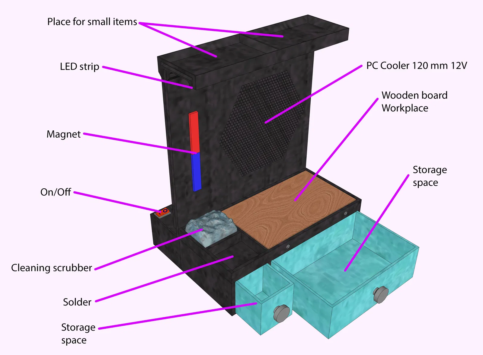 Giá đỡ/bàn làm việc đa năng cho việc hàn, tích hợp đèn nền, máy hút khói, nam châm và dụng cụ vệ sinh mỏ hàn. Có thể dùng pin hoặc nguồn điện, và tùy chọn gắn thêm tay phụ. Lý tưởng cho các tác vụ hàn cần sự tiện lợi và gọn gàng.