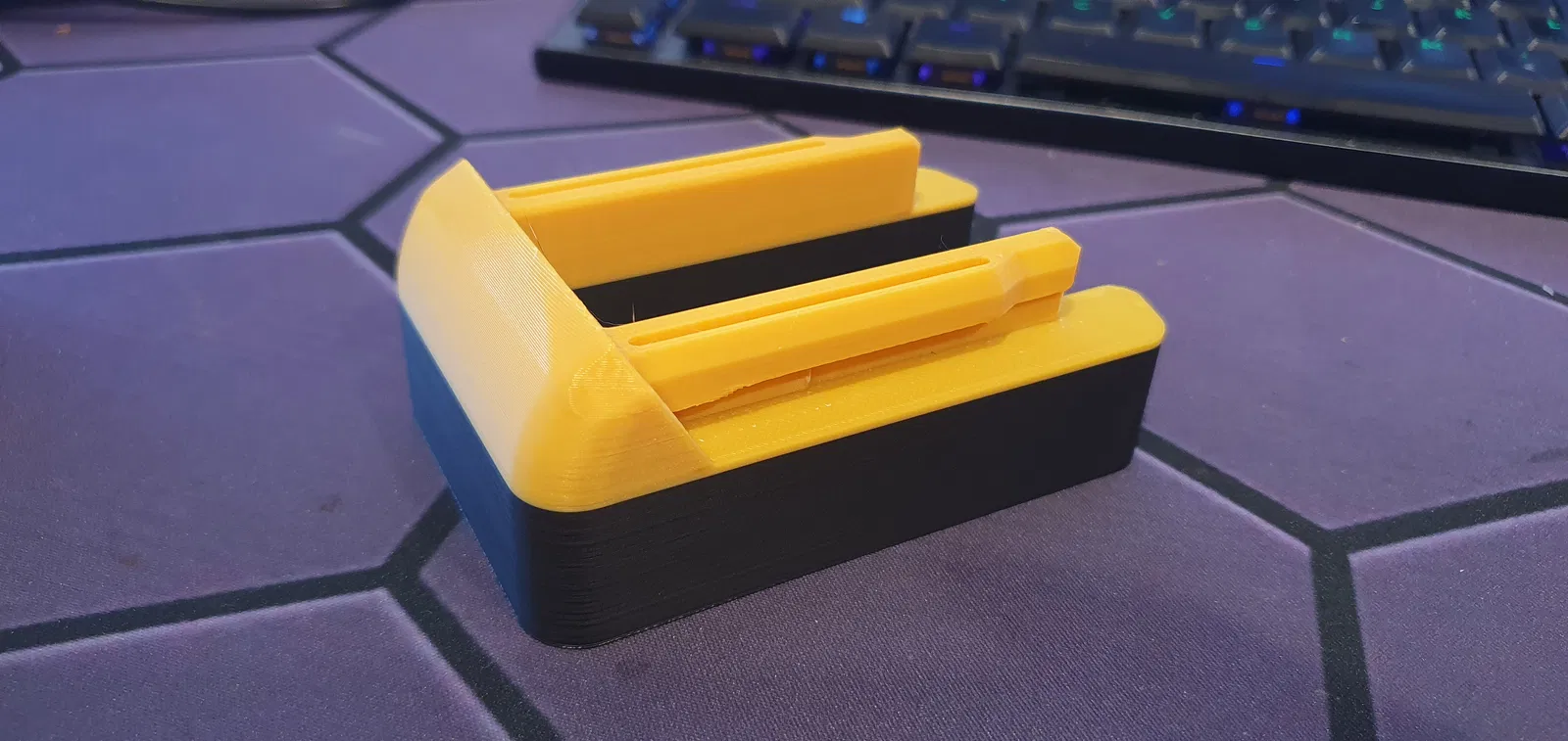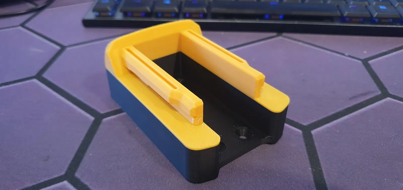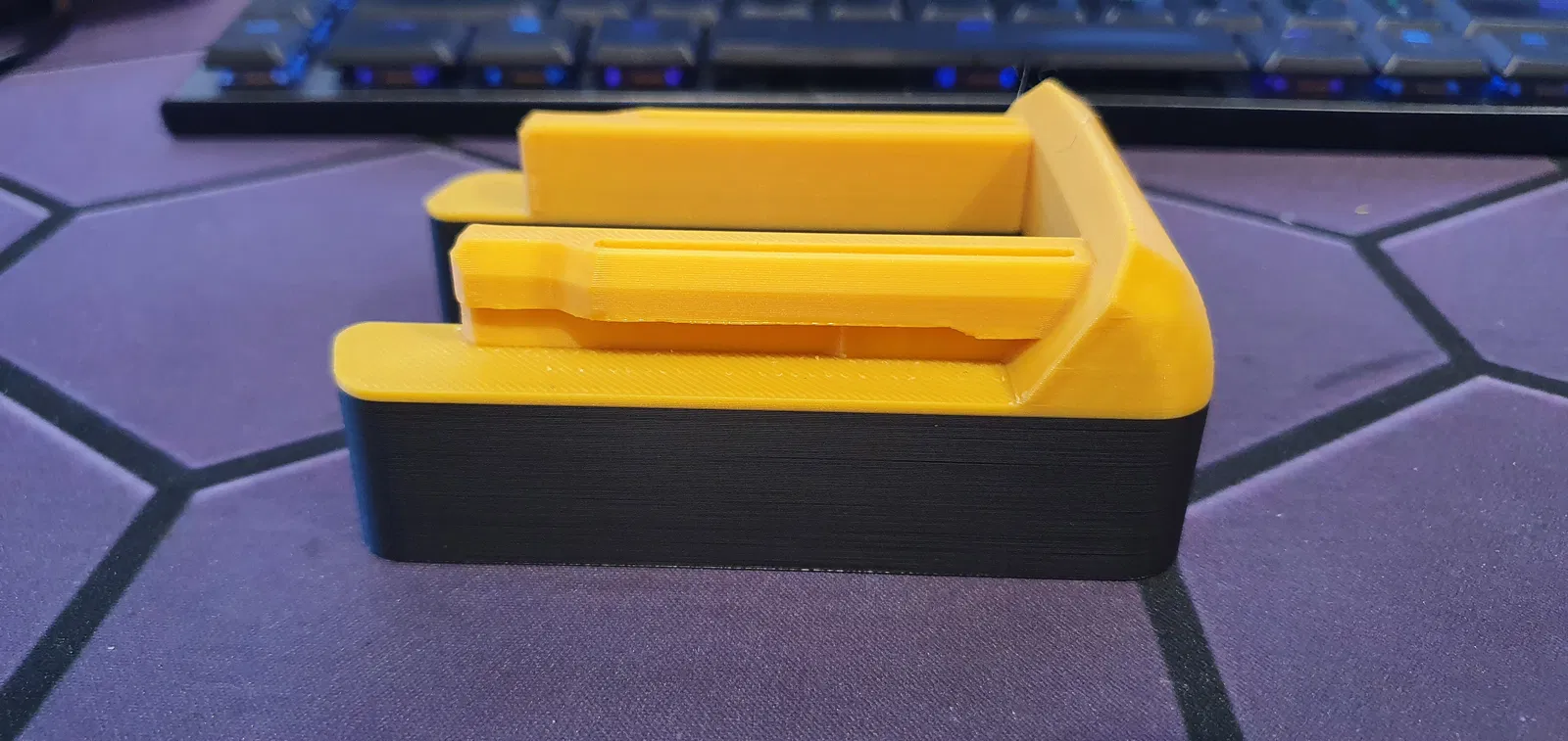 Đối với bản in thử nghiệm được hiển thị, tôi chỉ mới in cái này bằng Sunlu Black PLA+ và eSun Gold PLA+, trên máy in Bambu Labs X1C của tôi, in trên khay PEI nhám. Cần có giá đỡ chỉ cho phần nhô ra nơi dụng cụ trượt vào, rất dễ tháo và đã bong ra sạch sẽ trong trường hợp của tôi. Độ điền 15-25% chắc chắn là ổn, những cái này được in với 20%, 4 vách, 4 lớp trên/dưới - để có thêm một chút độ bền.
