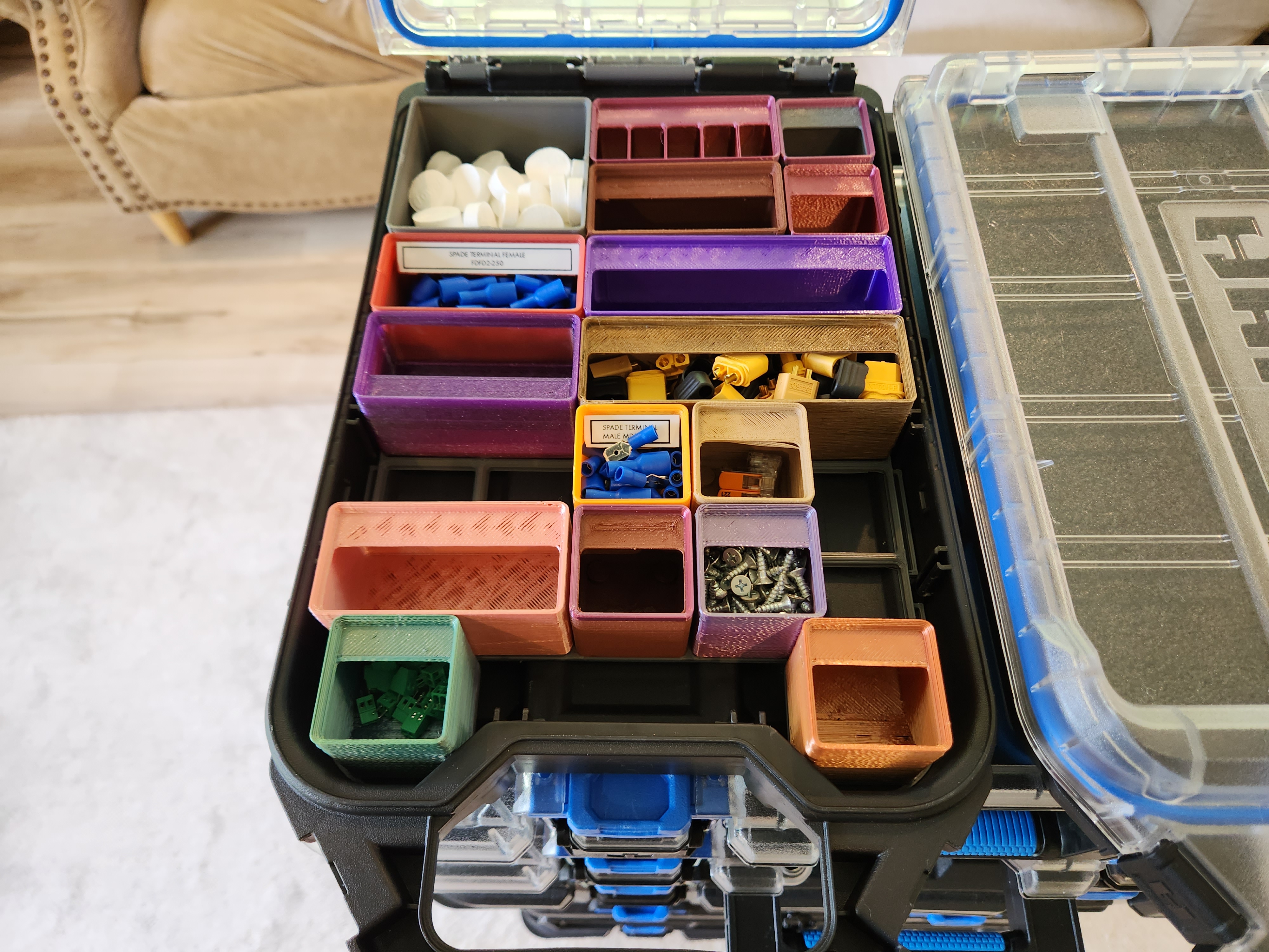 Các hộp đựng đồ nghề này có thể xếp chồng và khóa lại với nhau để dễ dàng mang đi, và chúng tình cờ khớp với kích thước Gridfinity rất tốt, các bộ phận thậm chí không bị rơi ra khi lắc.