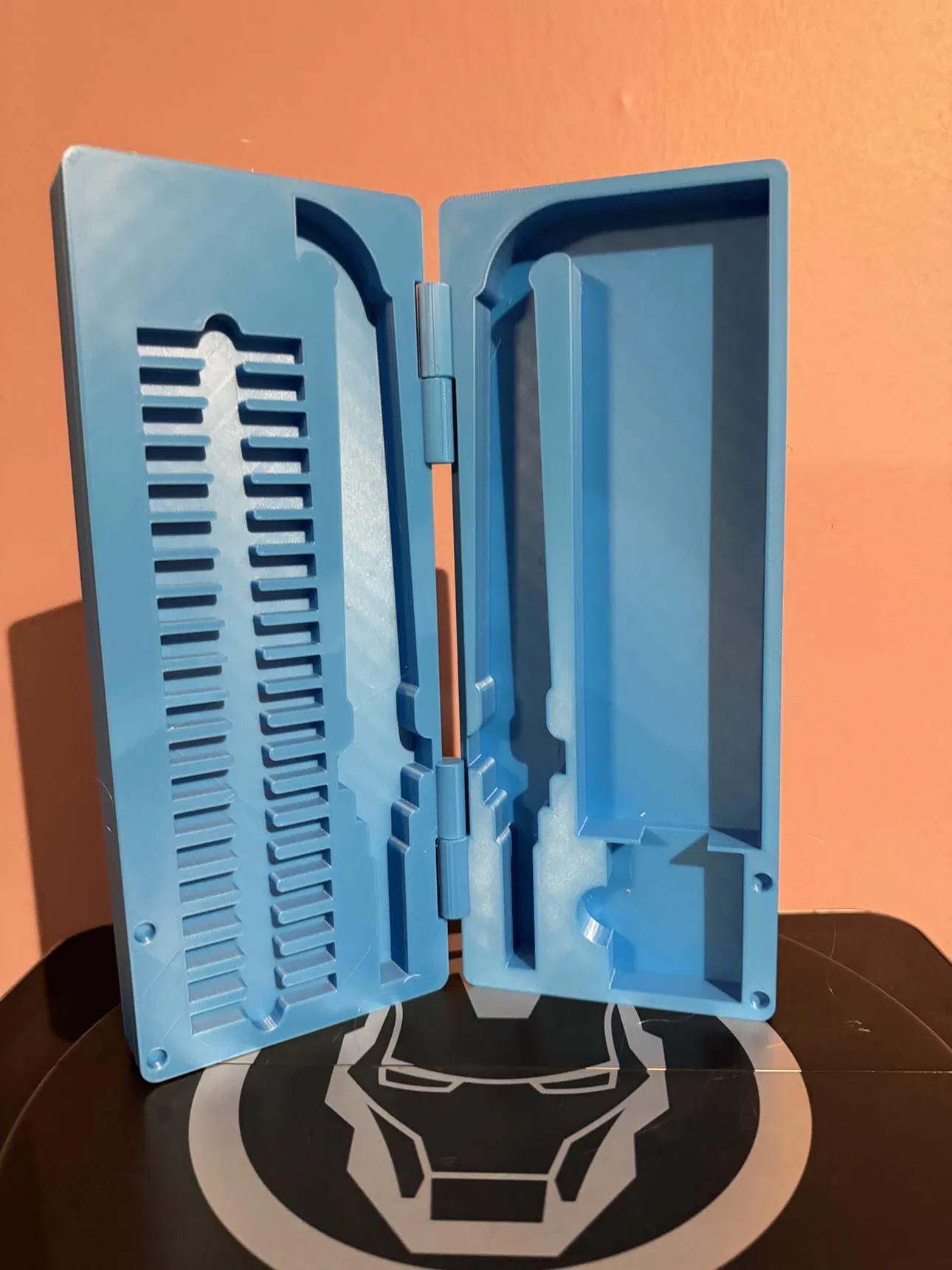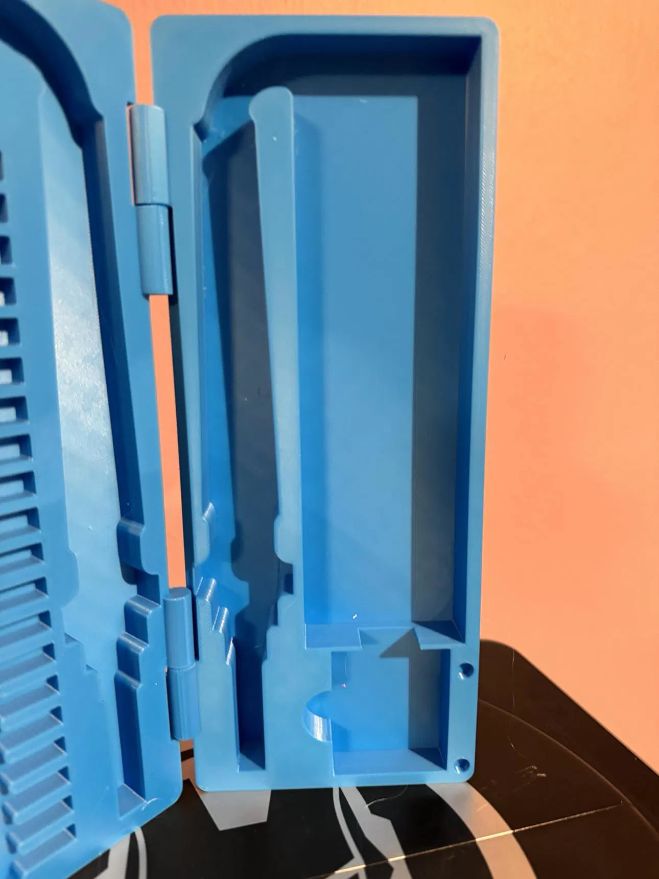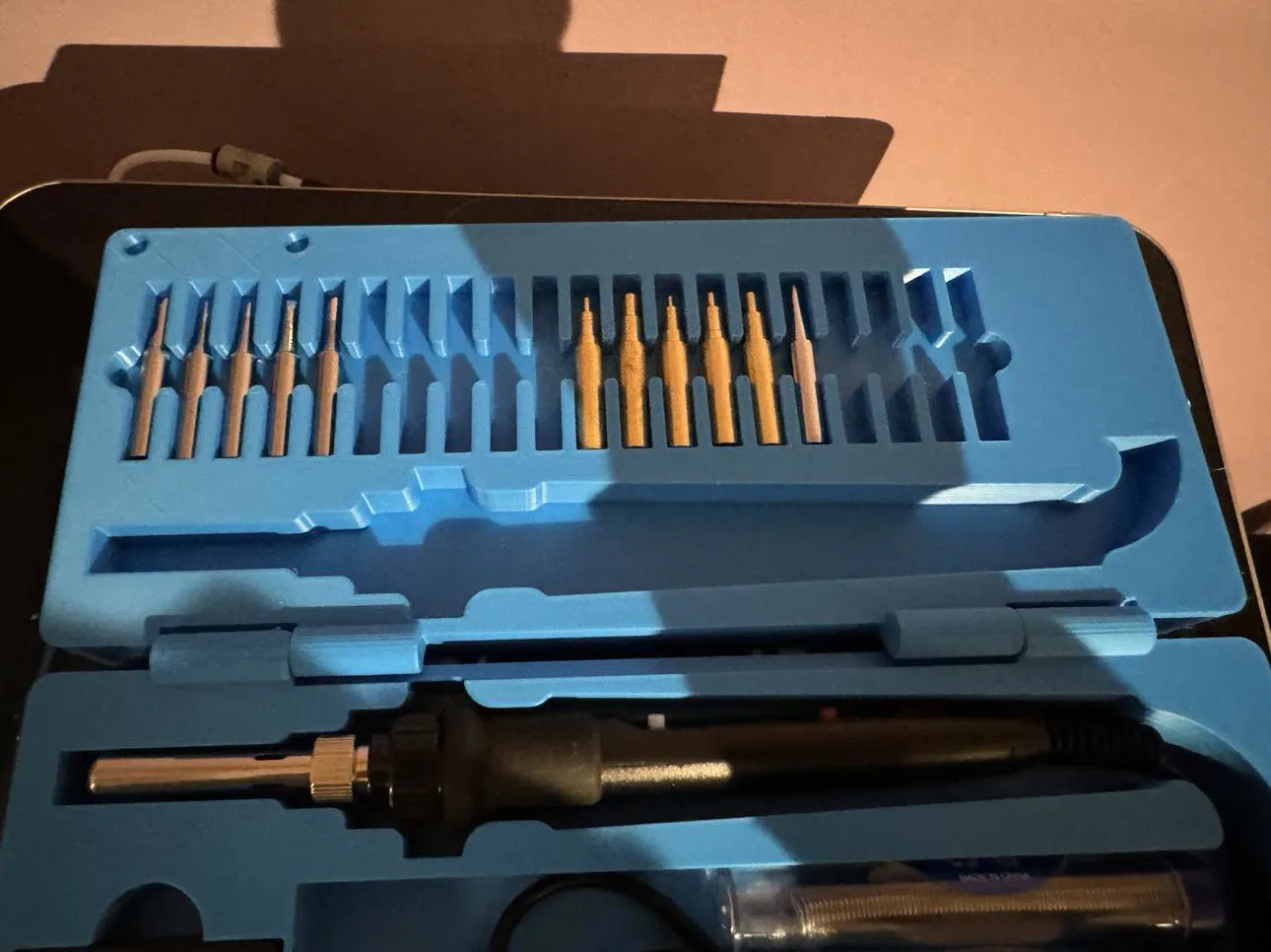 Hộp đựng máy hàn LeaderPro FSK-1020 80W, có chỗ gắn trên nắp để cất giữ các đầu hàn có thể thay thế. In ra không cần support, chỉ cần đặt phẳng trên bàn in là được.