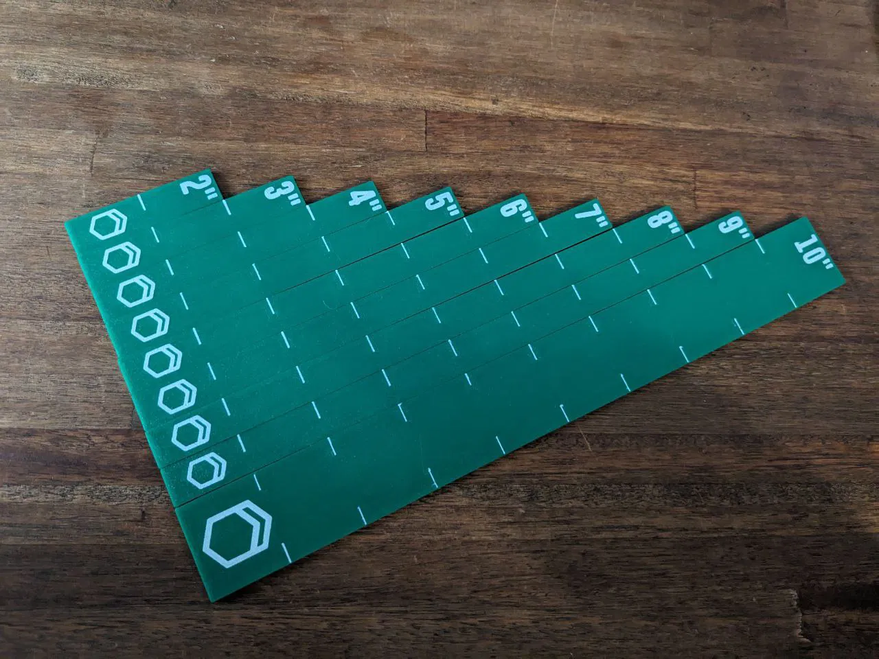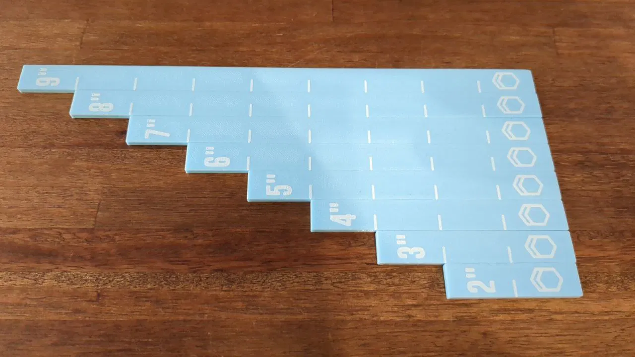 Bộ 9 thanh đo từ 2 đến 10 inch, rộng 0.5 inch để đặt vừa giữa các mô hình. Thanh 10 inch rộng 30mm, làm đường đi bóng cho Guild Ball. Có 2 phiên bản: trơn và có logo. Hỗ trợ in 2 màu dễ dàng với 1 đầu đùn.