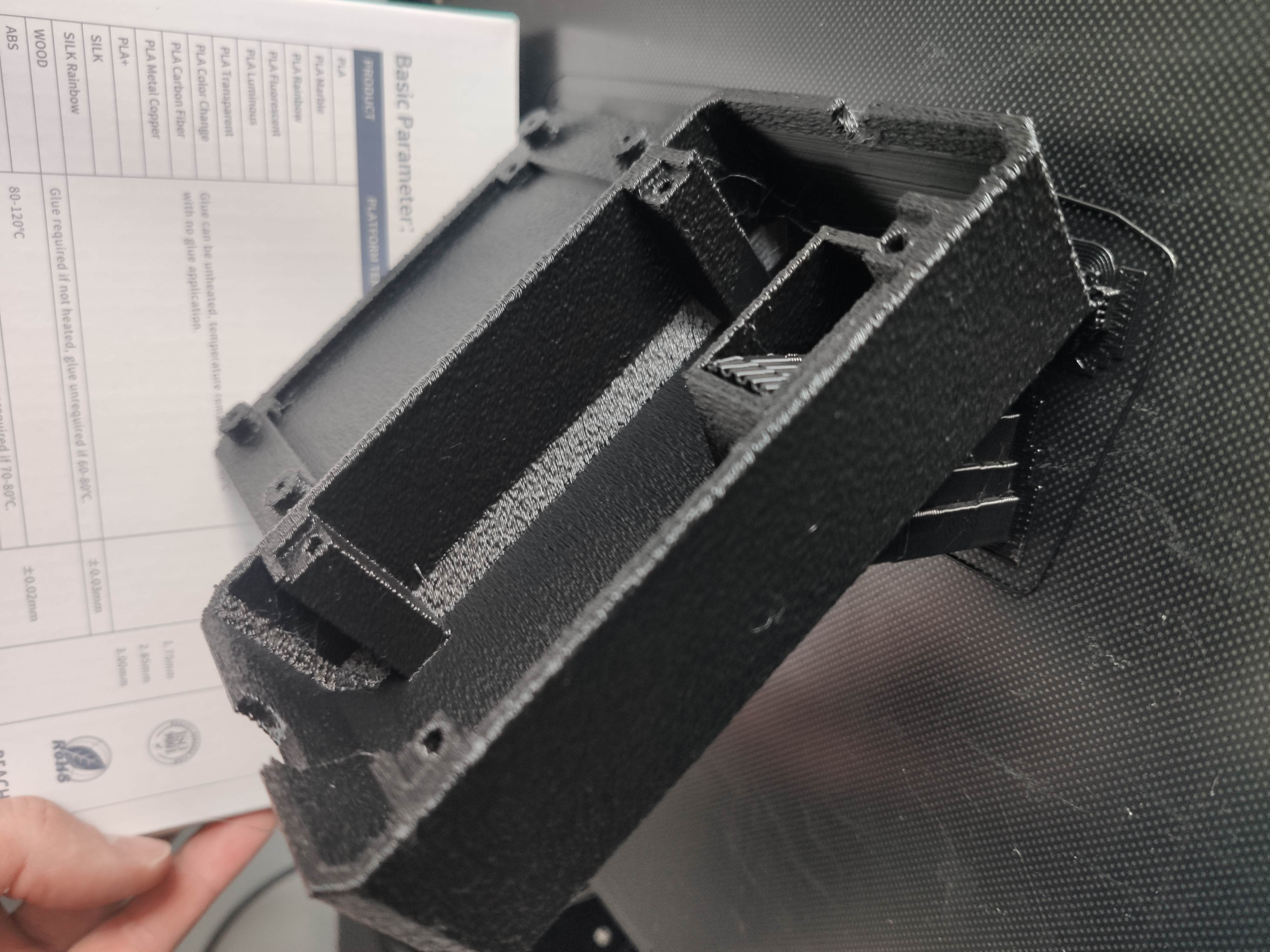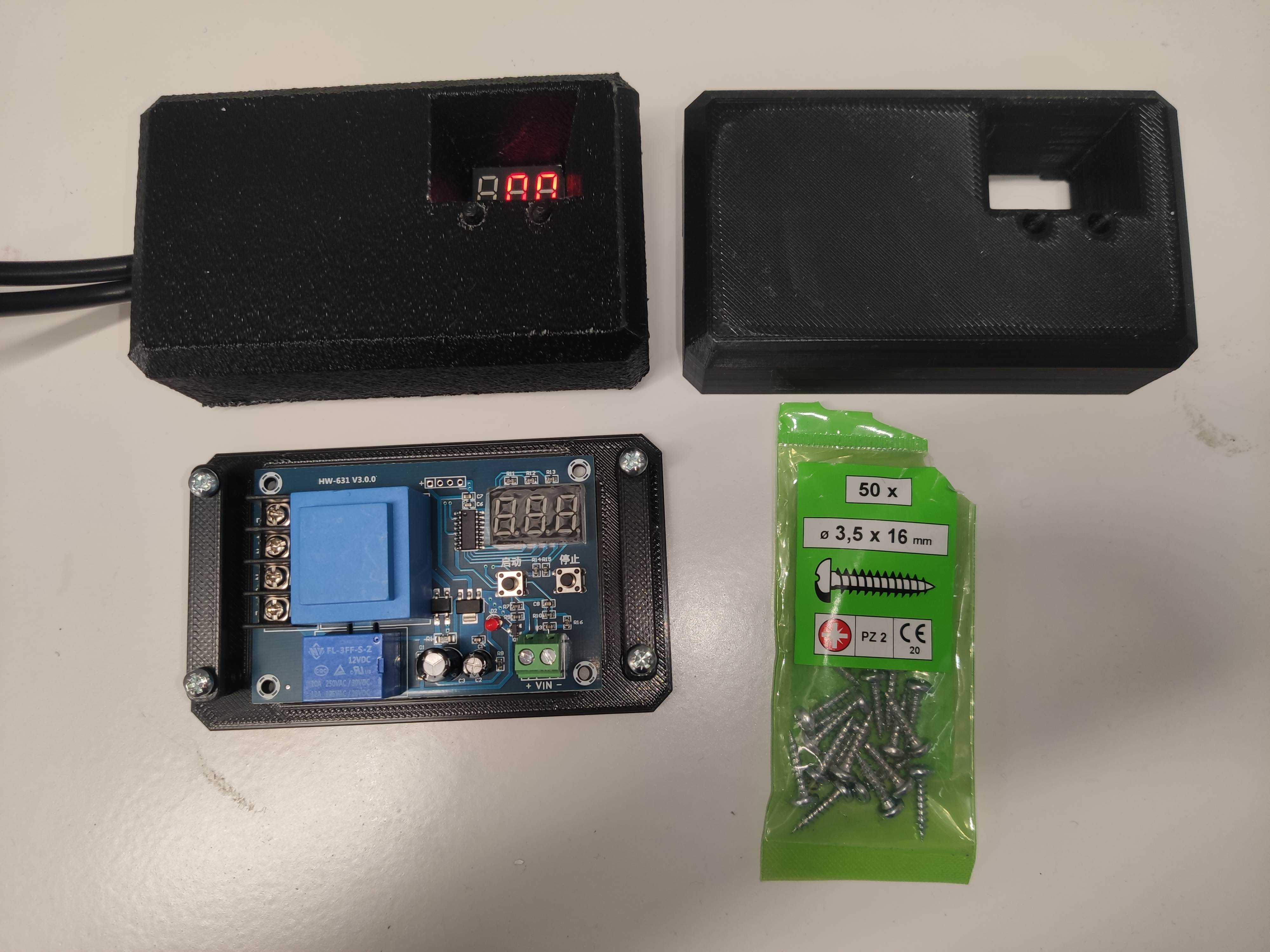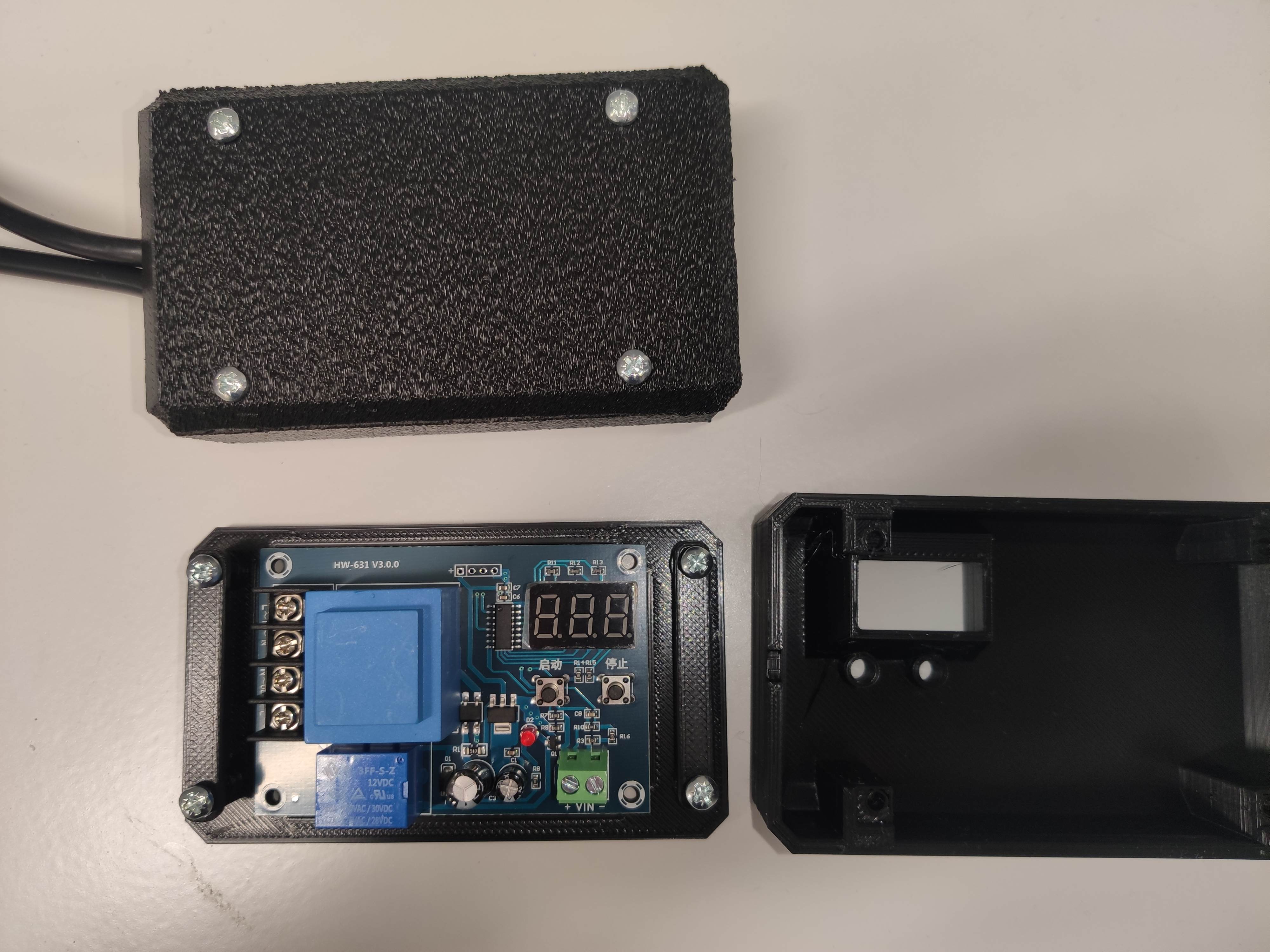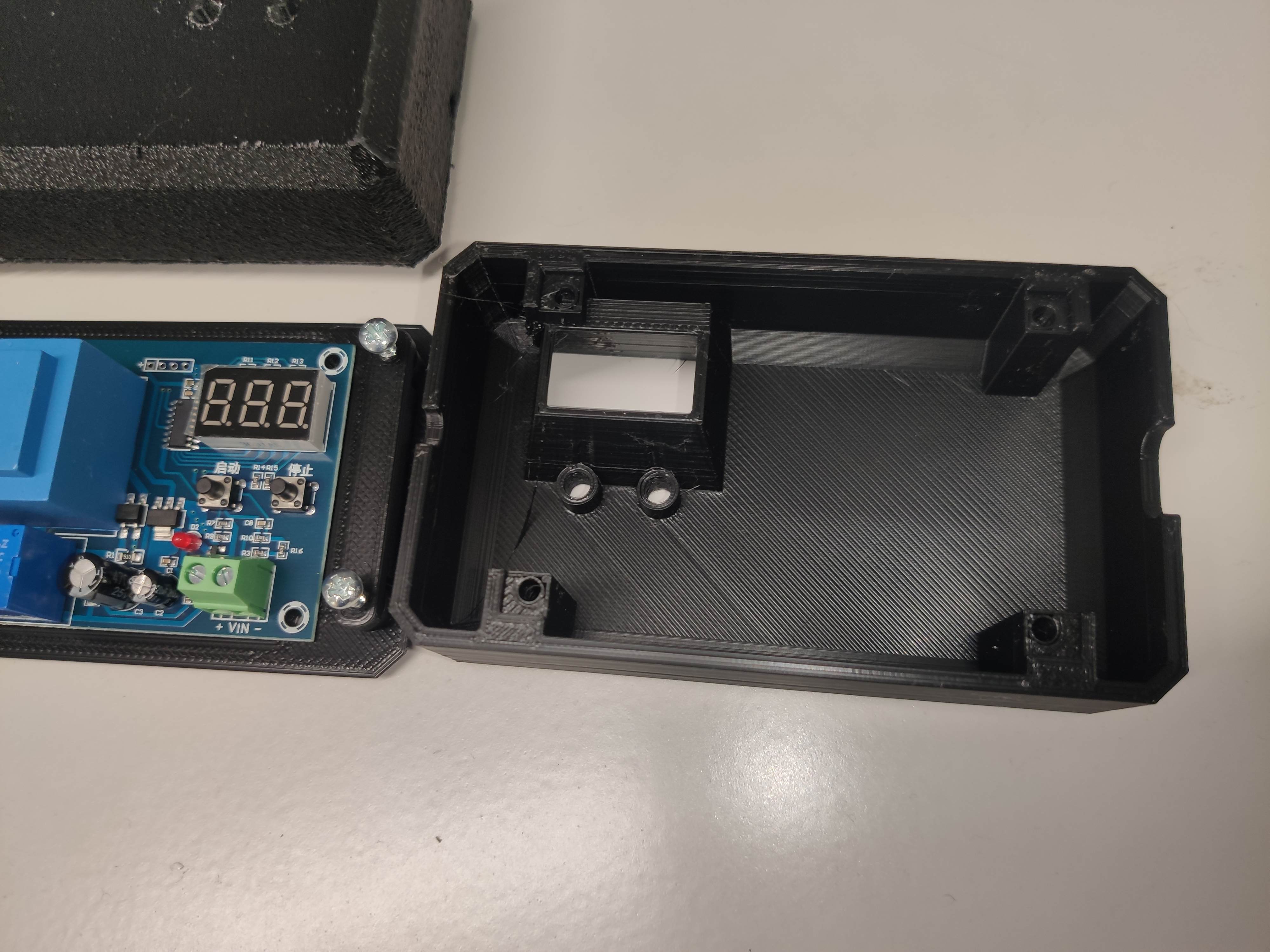 Để bảo vệ người dùng khỏi điện áp 230V, cần có vỏ hộp. Ngoài ra, cần có bộ phận giảm căng cho cáp 230V và bộ phận này đã được tích hợp. Có thể in ở hướng tiêu chuẩn mà không cần vật liệu hỗ trợ hoặc in ở hướng 45 độ với bề mặt vân sần (xem video youtube slant3d về hộp điện tử). Sơn thêm một ít vật liệu hỗ trợ ở đáy nếu in theo hướng này.