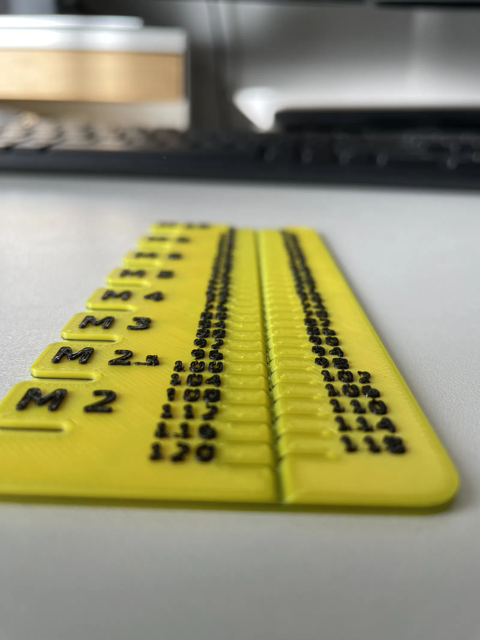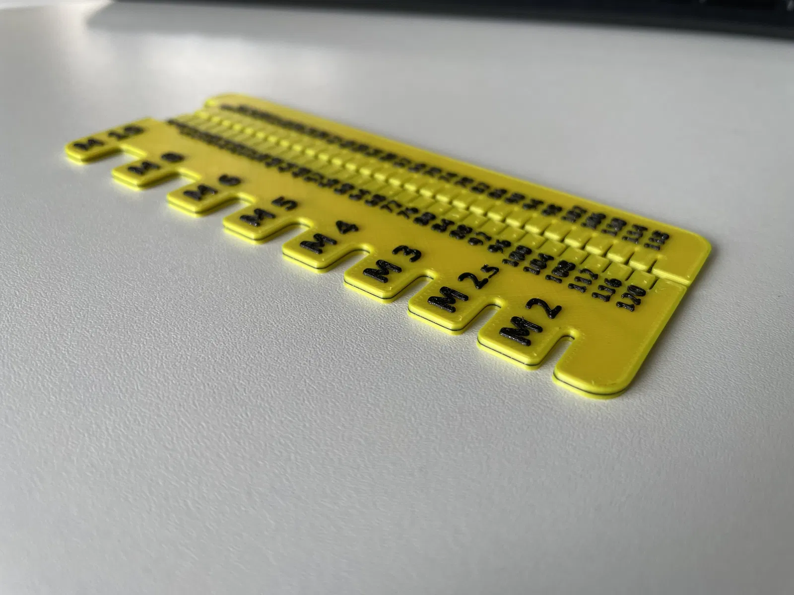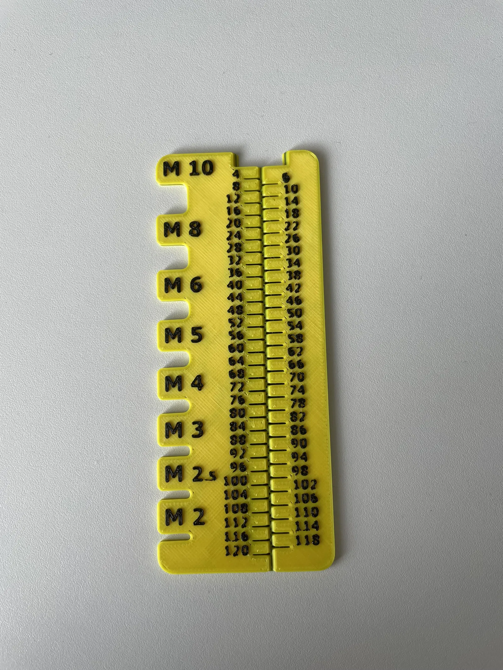 Phiên bản dụng cụ đo ốc này mỏng hơn, tiết kiệm vật liệu và in nhanh chóng. Bạn có thể dễ dàng đo chiều dài ốc với rãnh được thiết kế sẵn. Gcode đi kèm yêu cầu đổi vật liệu 2 lần để hiển thị rõ vạch chia và số đo.