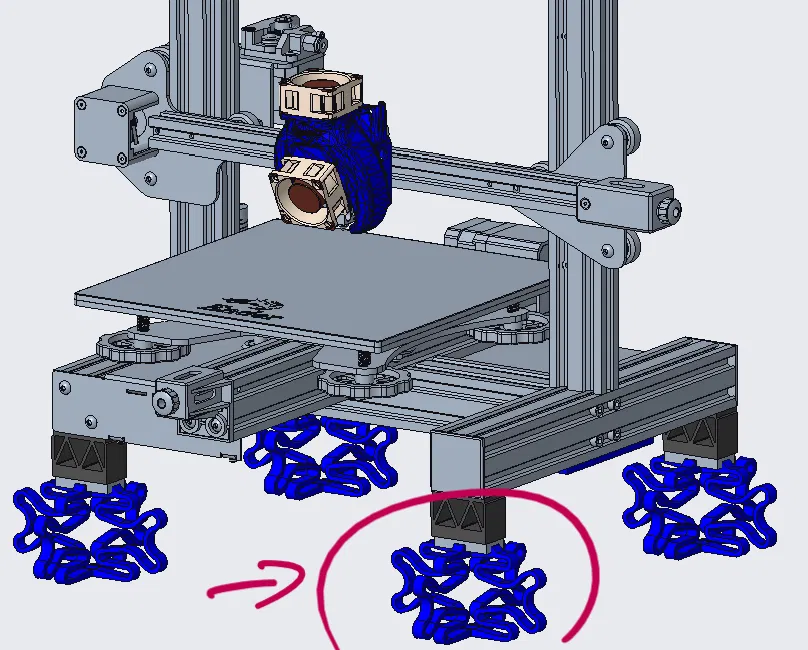Chân đế giảm rung cho Ender 3v2 giúp giảm tiếng ồn và rung lắc truyền từ máy in xuống bàn. Phiên bản lò xo mềm này hiệu quả hơn khi in tốc độ cao. Lưu ý chọn vật liệu in phù hợp như ASA thay vì PLA nếu dùng trong enclosure.