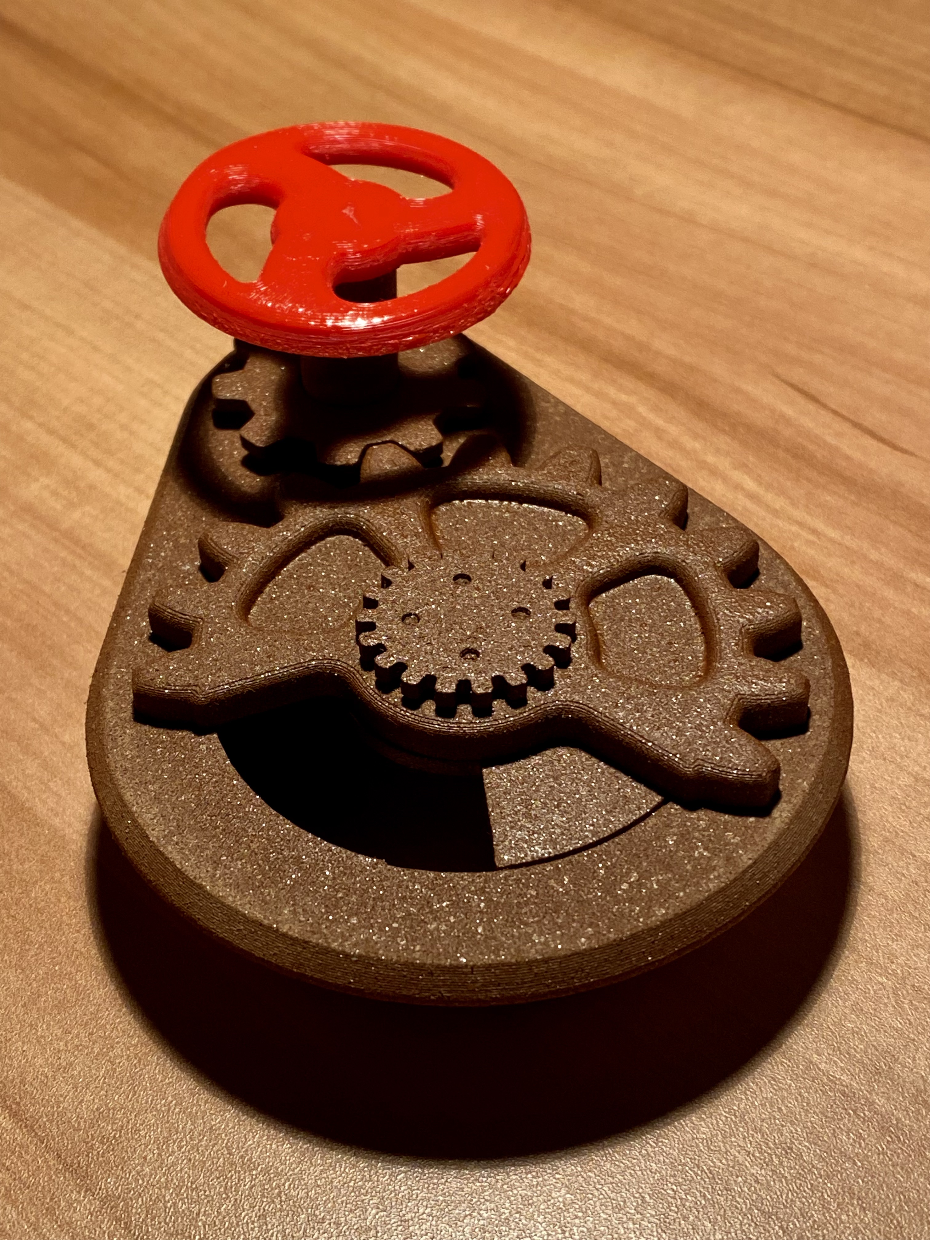 Cập nhật 1 Tôi đã ghi nhận những góp ý từ @Ayatoto_396910. Cảm ơn bạn lần nữa vì phản hồi nhé :-) #### Tóm tắt Tôi đã thiết kế cái "ổ cắm dây cáp" cơ khí theo phong cách steampunk này. Mấy cái bánh răng thì chạy ngon lành và bạn có thể mở/đóng cái lỗ để luồn dây cáp bằng "bánh xe nước" đó nha. * In không cần support! Tôi thì in bằng PLA trắng rồi sơn hiệu ứng rỉ sét đó.