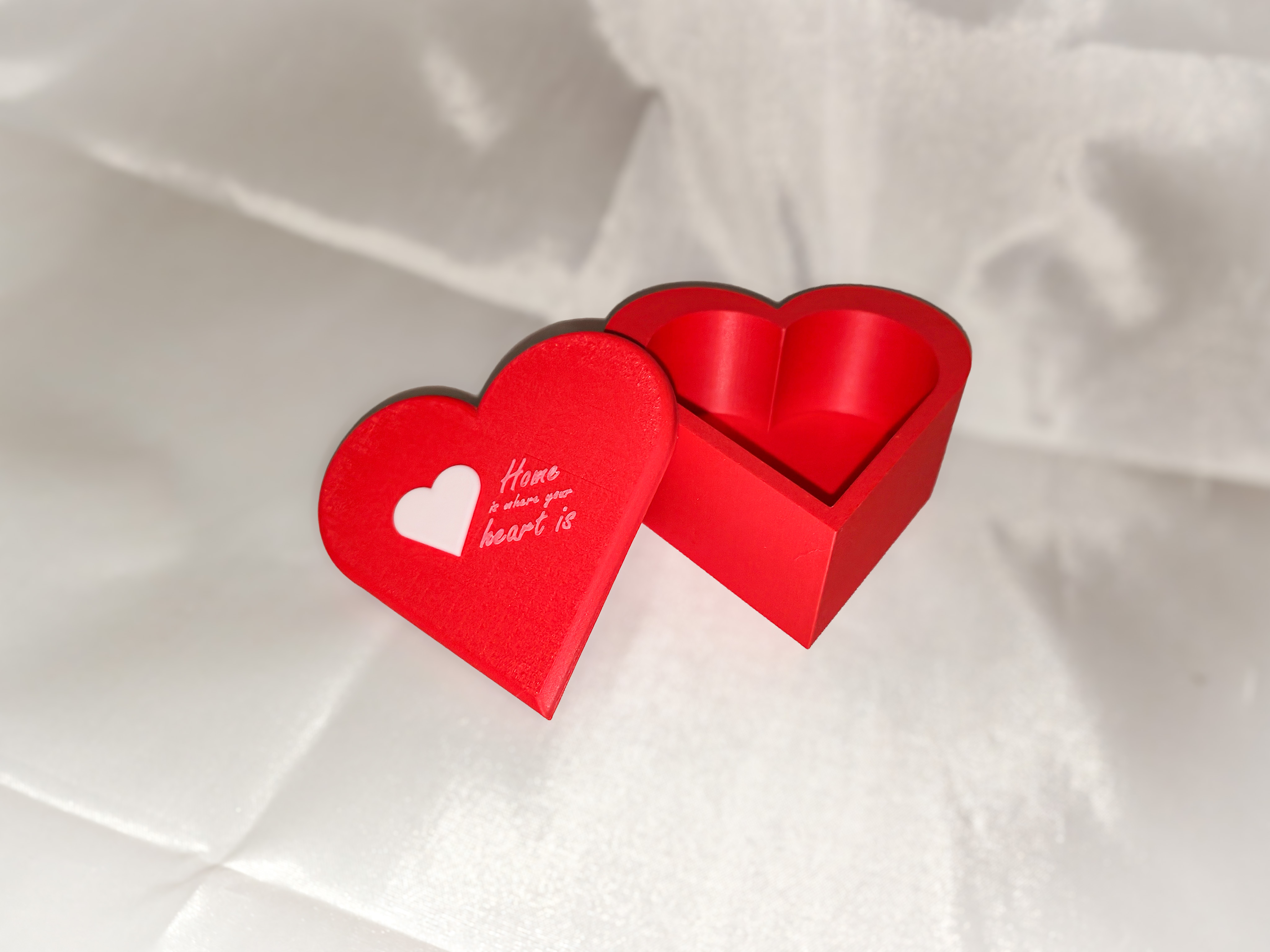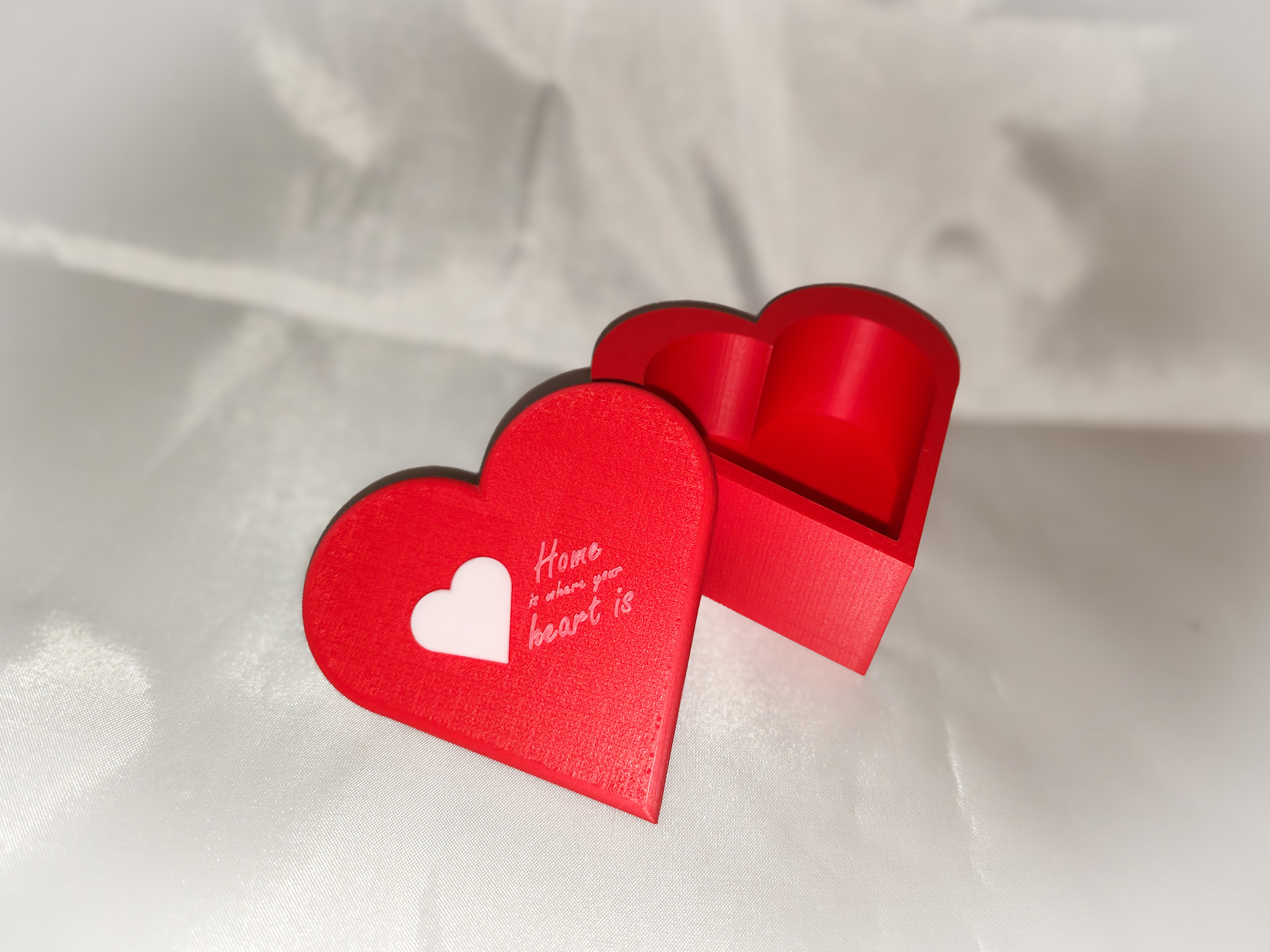 Hộp "Nhà là nơi trái tim thuộc về" cho Lễ Tình Nhân. Nắp hộp cần support để in. Đây là mẫu hộp đầu tiên của tác giả, được in bằng Bambu X1 Carbon với đầu phun 0.2mm, độ dày lớp in 0.1mm, 4 lớp thành và 15% infill.