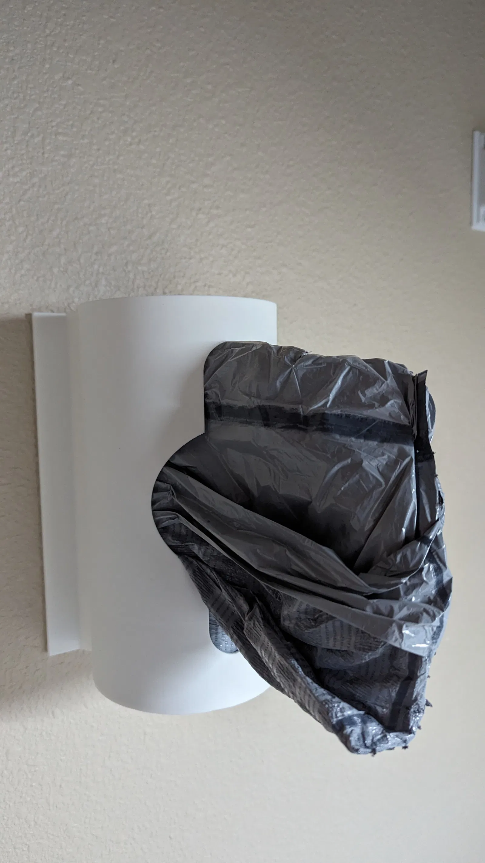 Thiết kế cho túi bếp Glad ForceFlex loại 40 cái. Gắn bằng miếng dán Command cỡ vừa. Đường kính 105mm, cao 205mm.