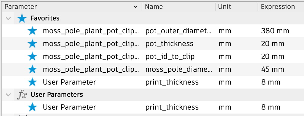 Hiện tại tôi đang dùng nó để đỡ cây Monstera, nhưng mô hình (.f3d có sẵn) đã được tham số hóa (xem hình) và bạn có thể tùy chỉnh cho chậu cây của riêng mình.