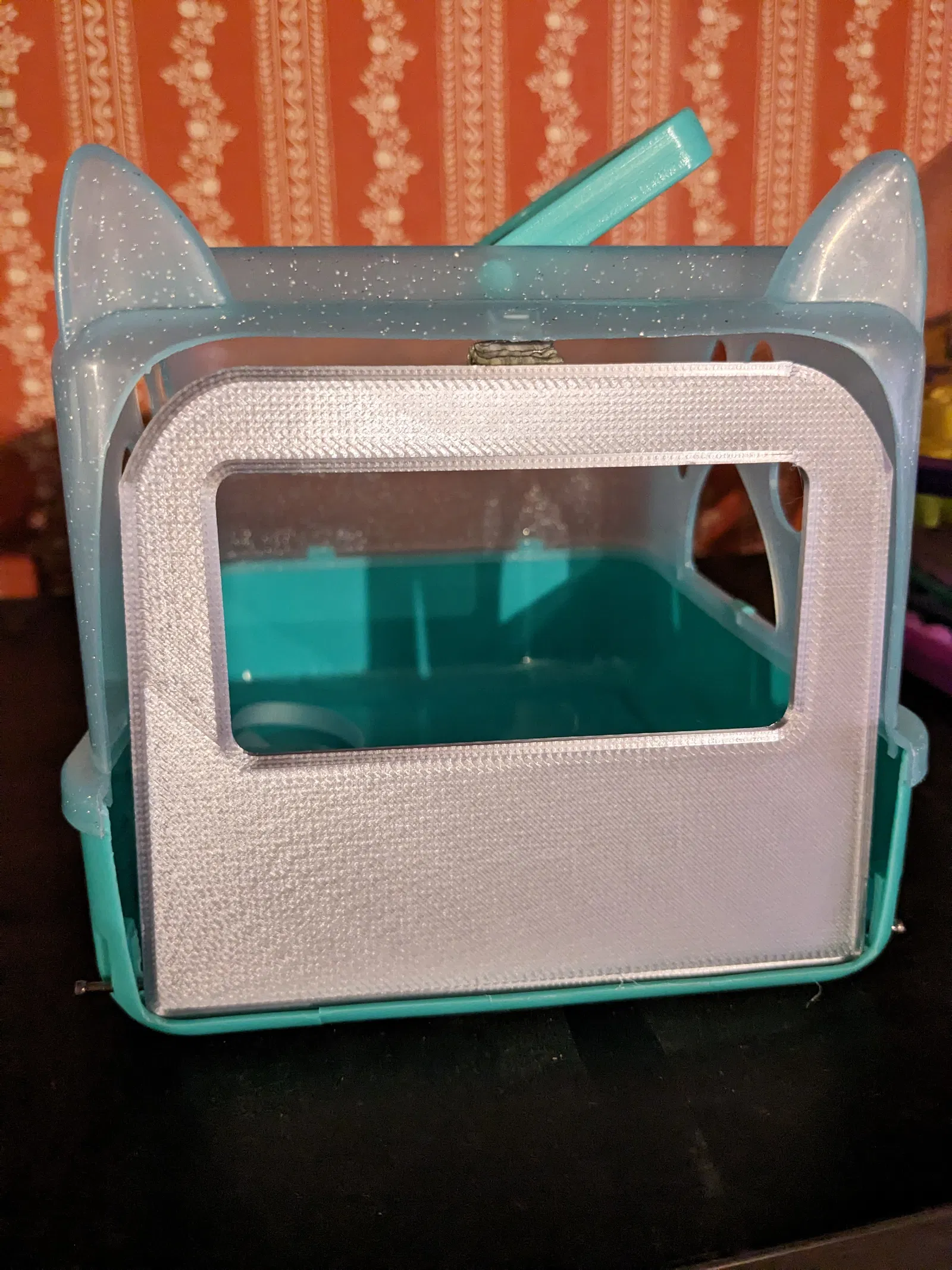 Cái này là để sửa cái lồng vận chuyển mèo đồ chơi mà con gái tui được tặng hồi Giáng sinh từ cửa hàng 5-below. Tui không nhớ hãng nào và cũng không thấy ghi gì hết trơn. Nghe ngộ ha, cái cửa zin nó không chịu nổi cái vụ lăn xuống cầu thang. Nên tui mới áng chừng làm cái thay thế, xài đinh hoàn thiện để làm phần bản lề quan trọng. Đây là cái tui đem đi in nè 😎