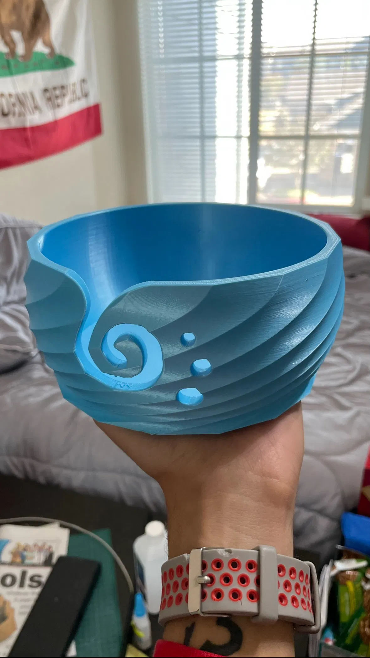 Để cho nặng, tui có làm thêm cái đáy giả rồi đổ đầy một lớp bi sắt 4.5mm vô, rồi dán cái đáy lại bằng keo siêu dính (CA glue). Tùy máy in của bạn mà có thể bạn sẽ muốn chà nhám mấy cái lỗ cho nó mịn lại để len không bị vướng vô đâu hết.
