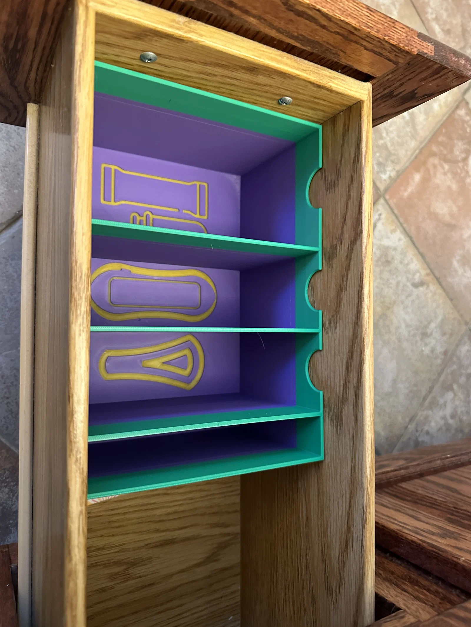 Hai hộp đựng đồ để sắp xếp các vật dụng trong ngăn kéo dưới của phòng tắm chính nhà mình. Phiên bản cao có bốn ngăn - một cho tampon, một cho băng vệ sinh loại thường, một cho băng vệ sinh loại quần lót (thong liners), và một cho một món đồ gọi là que nhỏ giọt (drip stick). Những món đồ này dự định để đứng thẳng nhưng cũng có thể để nằm ngang.