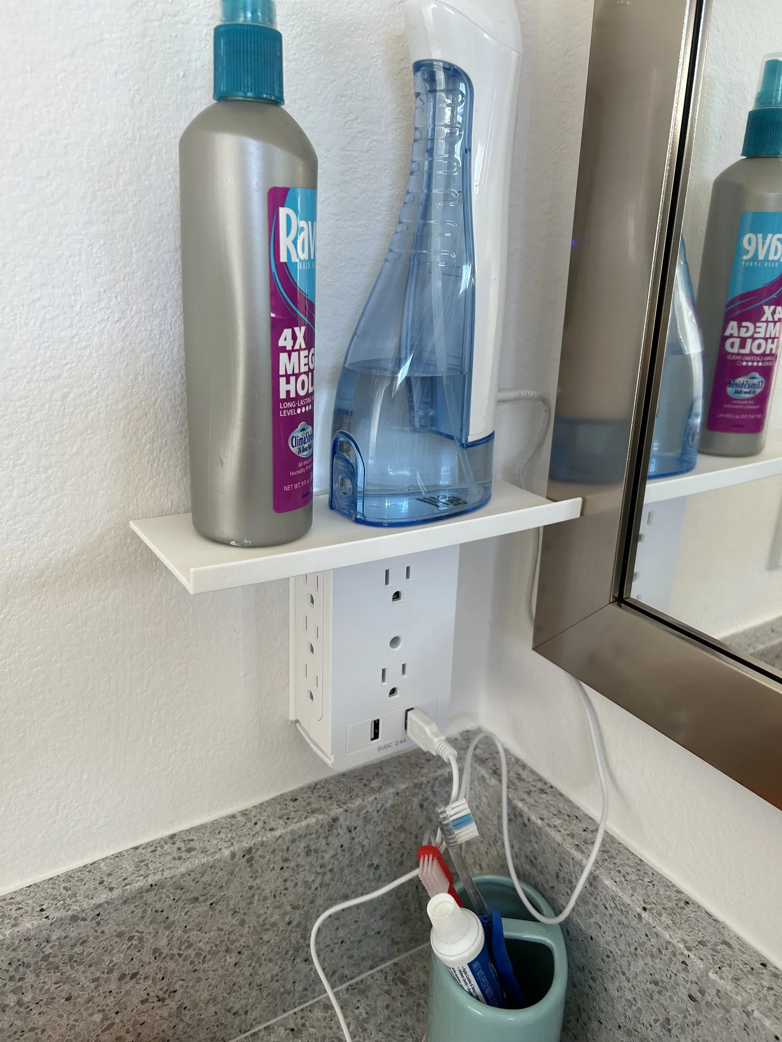 Thay đổi chính là, ở nhà tắm của tui, cái ổ cắm nó nằm sát tường/tủ thuốc kế bên quá nên tui phải dịch cái kệ ra khỏi chỗ gắn để nó trượt qua.