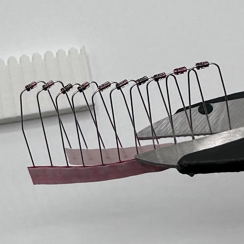 Cái khuôn này giúp bạn uốn chân diode dễ dàng, khoảng cách 8mm. Chứa 10 diode cùng lúc, chỉ cần luồn vào, bẻ bằng tay rồi cắt băng keo. Rất tiện lợi cho việc ráp bàn phím tách rời.