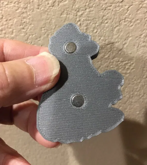 Nam Châm Hình Poodle, dùng nam châm tròn đường kính 6mm, dày 3mm. Keo siêu dính là xài được để gắn nam châm vô mấy cái lỗ ở phía sau. In với độ cao lớp là .2mm thì tốn 7 gram nhựa PLA.