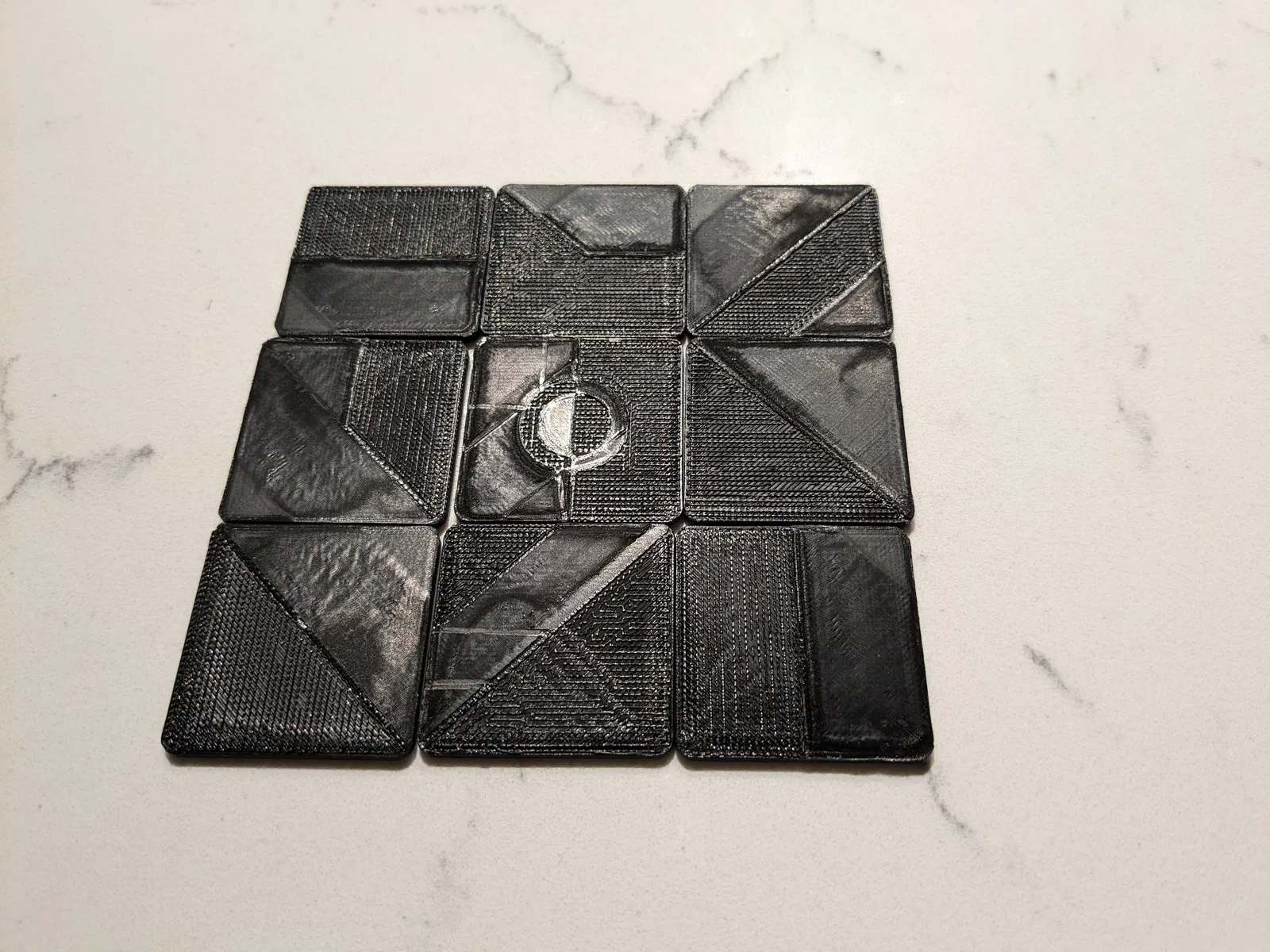 Tui mới biết tới cái game xếp gạch nhỏ xíu Chartae của ông Knizia gần đây thôi. Hình như ở Mỹ không có bán nên tui quyết định tự làm một phiên bản vì tui thích hầu hết các game của ổng. Tui đã cố gắng làm cho nó chỉ cần in một màu thôi bằng cách dùng các vân khác nhau. Tui bật chế độ 'ironing' trong Cura cho mấy cái bóng bẩy và dùng một vân mờ thô trên mấy cái còn lại. Cuối cùng thì cũng xài được nhưng không được đẹp lắm. Nên tui làm thêm một phiên bản nữa yêu cầu đổi màu trước mấy lớp cuối (sau 2mm).