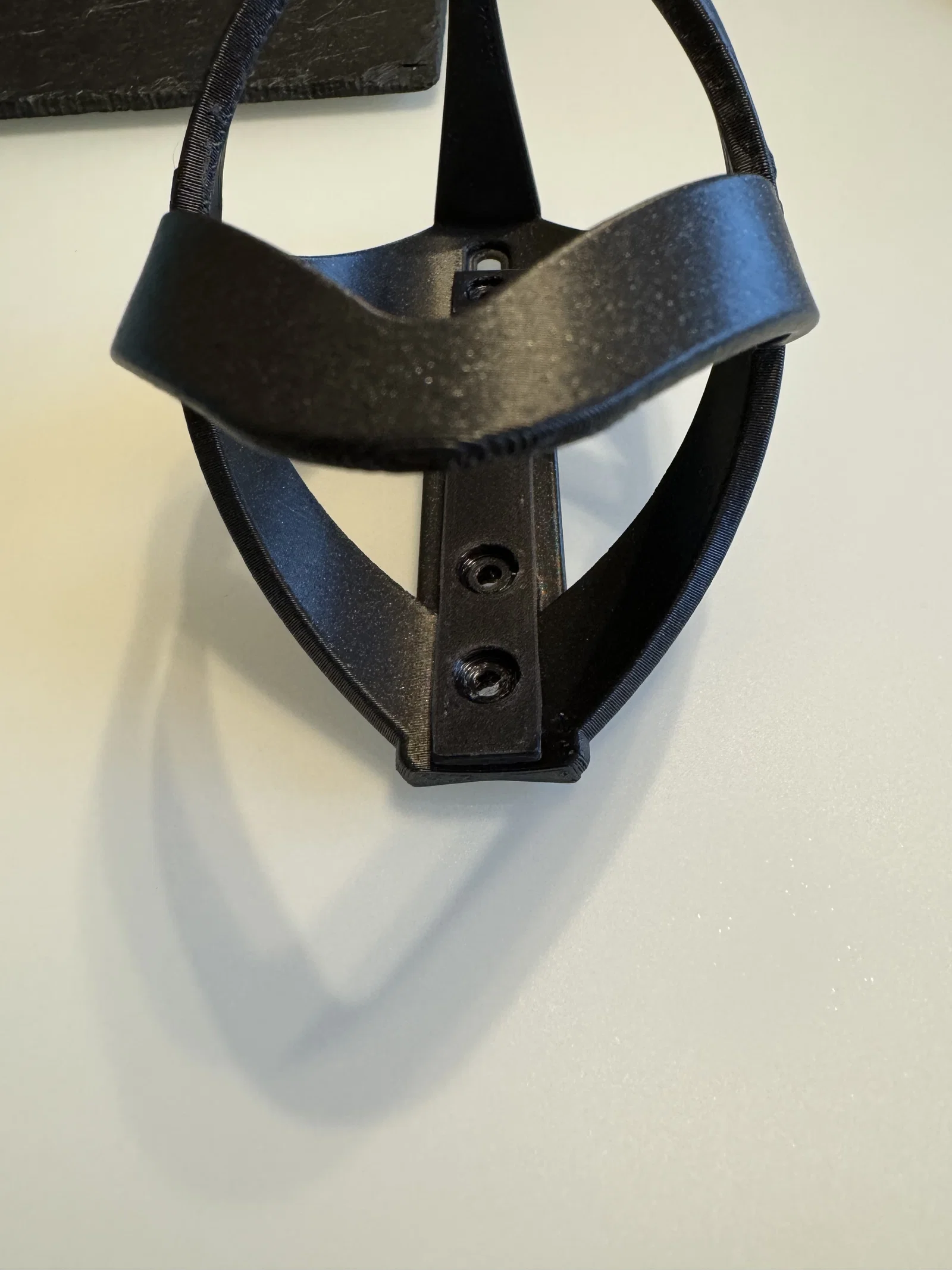 Cái đế được chụp hình là in từ nhựa Taulman PCTPE, còn cái lồng đựng chai thì in từ Prusament ASA Galaxy Black.