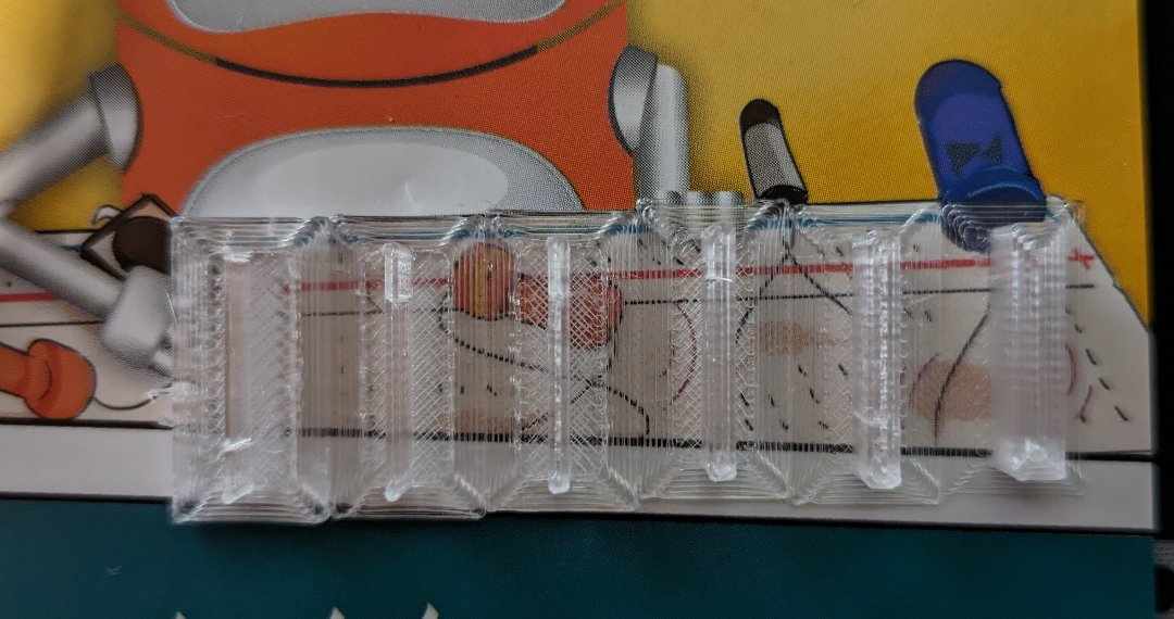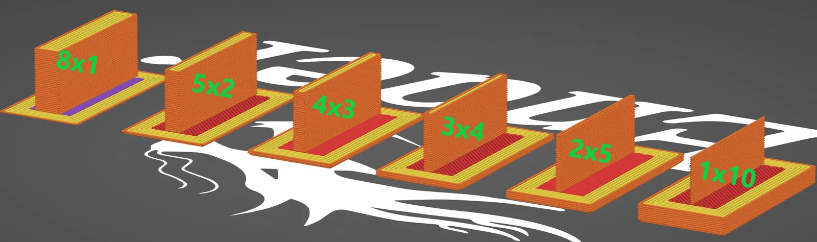 Mấy cái mẫu đơn giản để test độ trong suốt của filament. Mấy con số trên mẫu in ra tượng trưng cho giá trị số vòng lặp (perimeters) với cài đặt chuẩn (nozzle 0,4mm, layer height 0,2mm), số đầu tiên là số vòng lặp, số thứ hai là số lớp (8x1 nghĩa là 8 vòng lặp, 1 lớp). Bài test cụ thể này được thực hiện với loại filament này: https://www.aurapol.com/p/p-pet-g-filament-natural-transparent-1-kg-1-75-mm-aurapol
