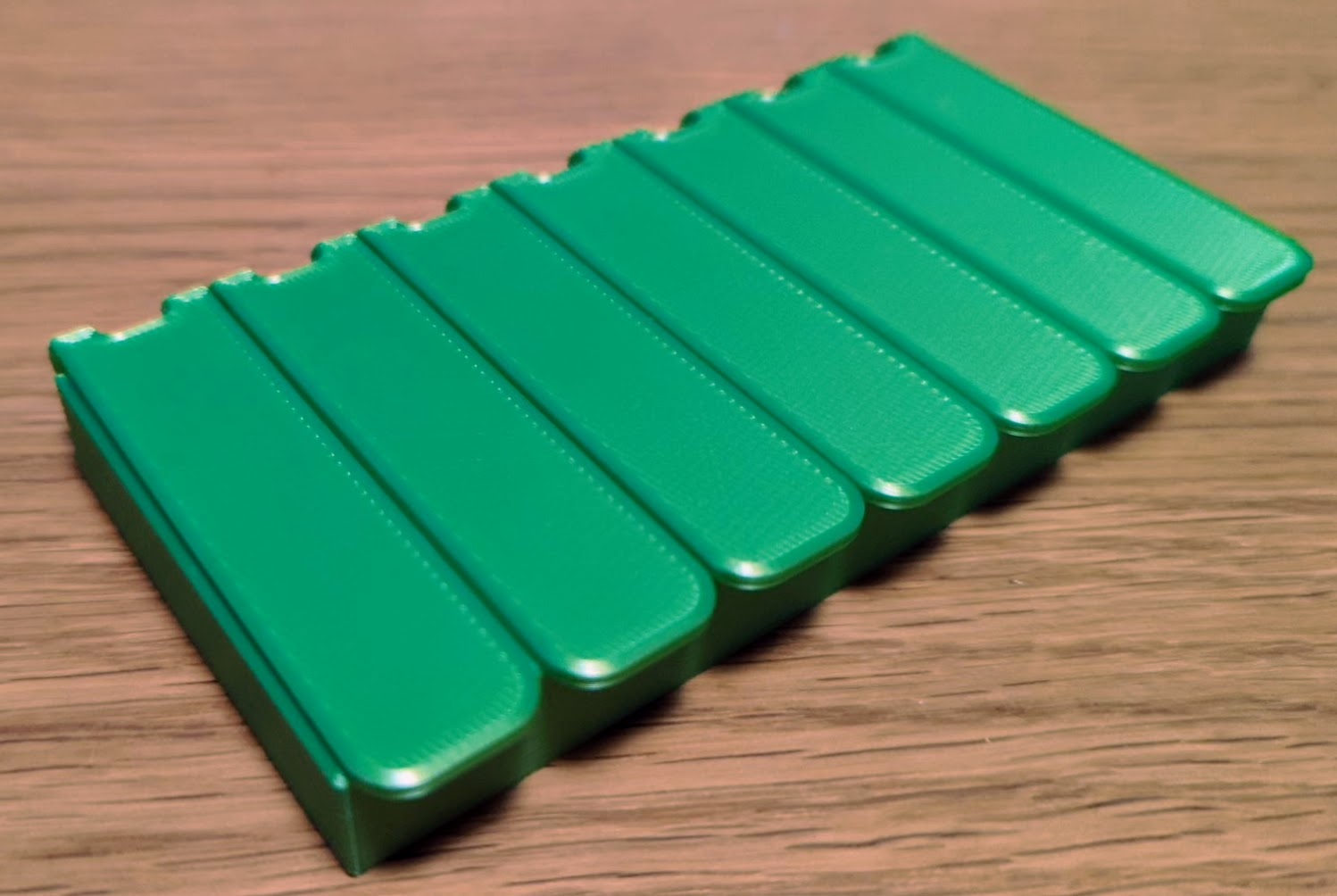 Một cái hộp có 7 ngăn, mỗi ngăn cho một ngày, để đựng thuốc, với bản lề in sẵn (print-in-place hinges). Mỗi nắp đều có khấc và đóng mở khá chắc tay.