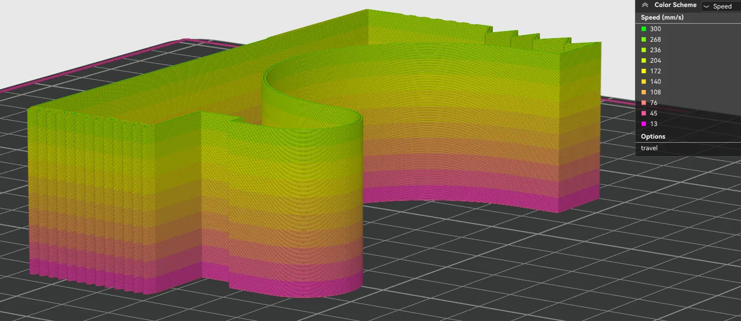 Model có chiều cao 30mm, với các phần 3mm, nên có thể kiểm tra 10 tốc độ khác nhau (ví dụ: 20 đến 200 mm/s).