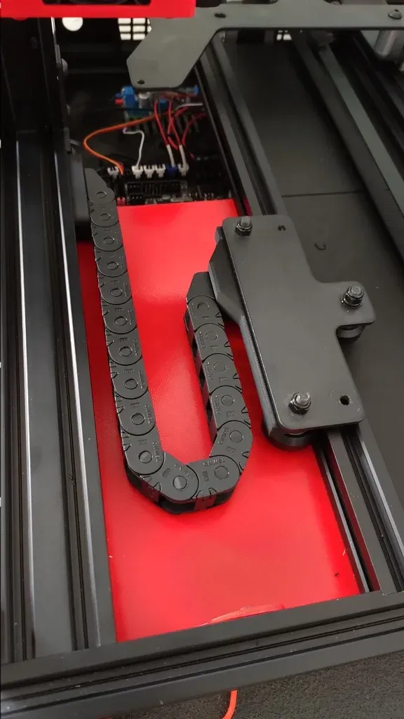 Cả dây cáp X và Y đều được gắn vào một giá đỡ trên tấm gắn động cơ extruder. Cái này được làm lại hoàn toàn bằng Tinkercad, nhưng về thiết kế thì mình đã dựa trên Slim X Axis Cable Chain with Extruder and Hotend Mount for Ender 3 Pro của norp ngày 27 tháng 4 năm 2020.