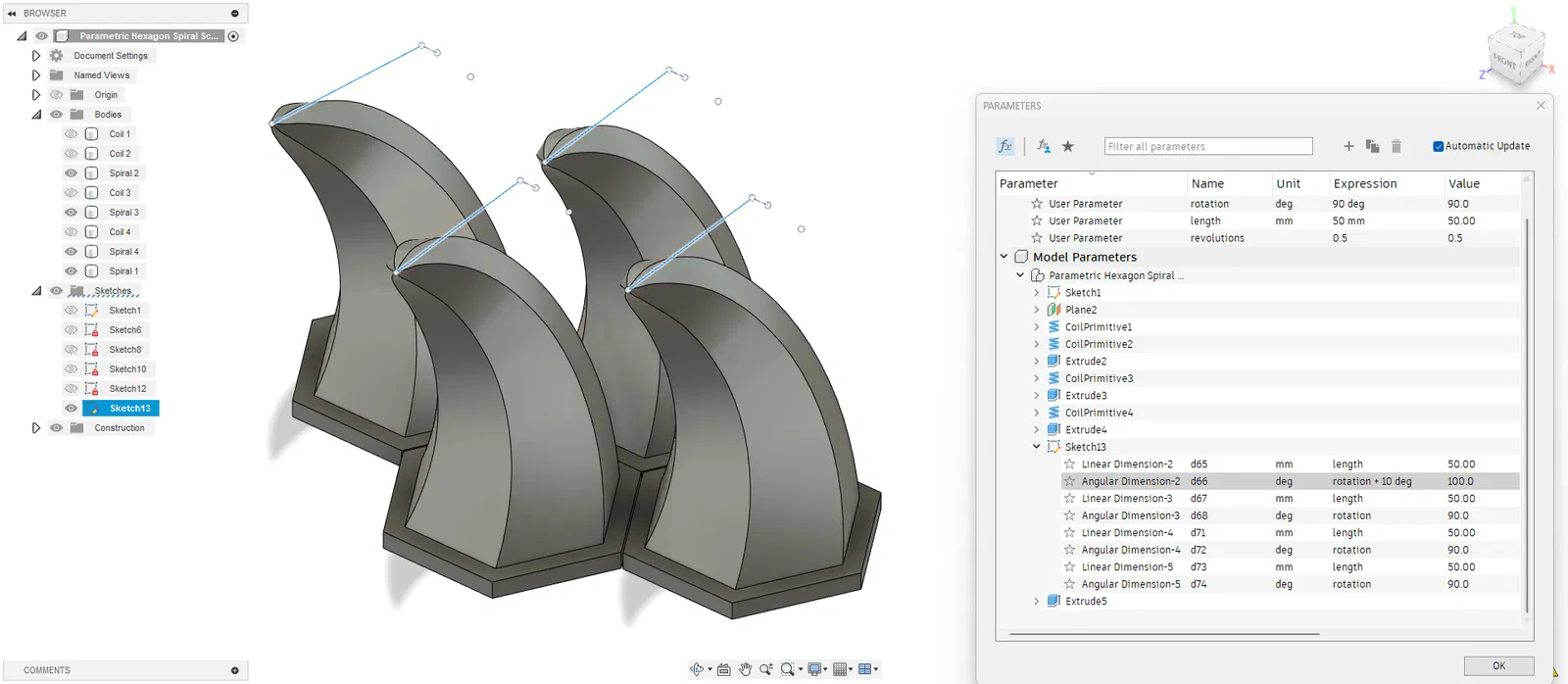 Tui có thêm file Fusion 360 xoắn ốc lục giác nhóm, thay đổi tham số xoay là mấy cái xoắn ốc nó quay theo hướng khác.