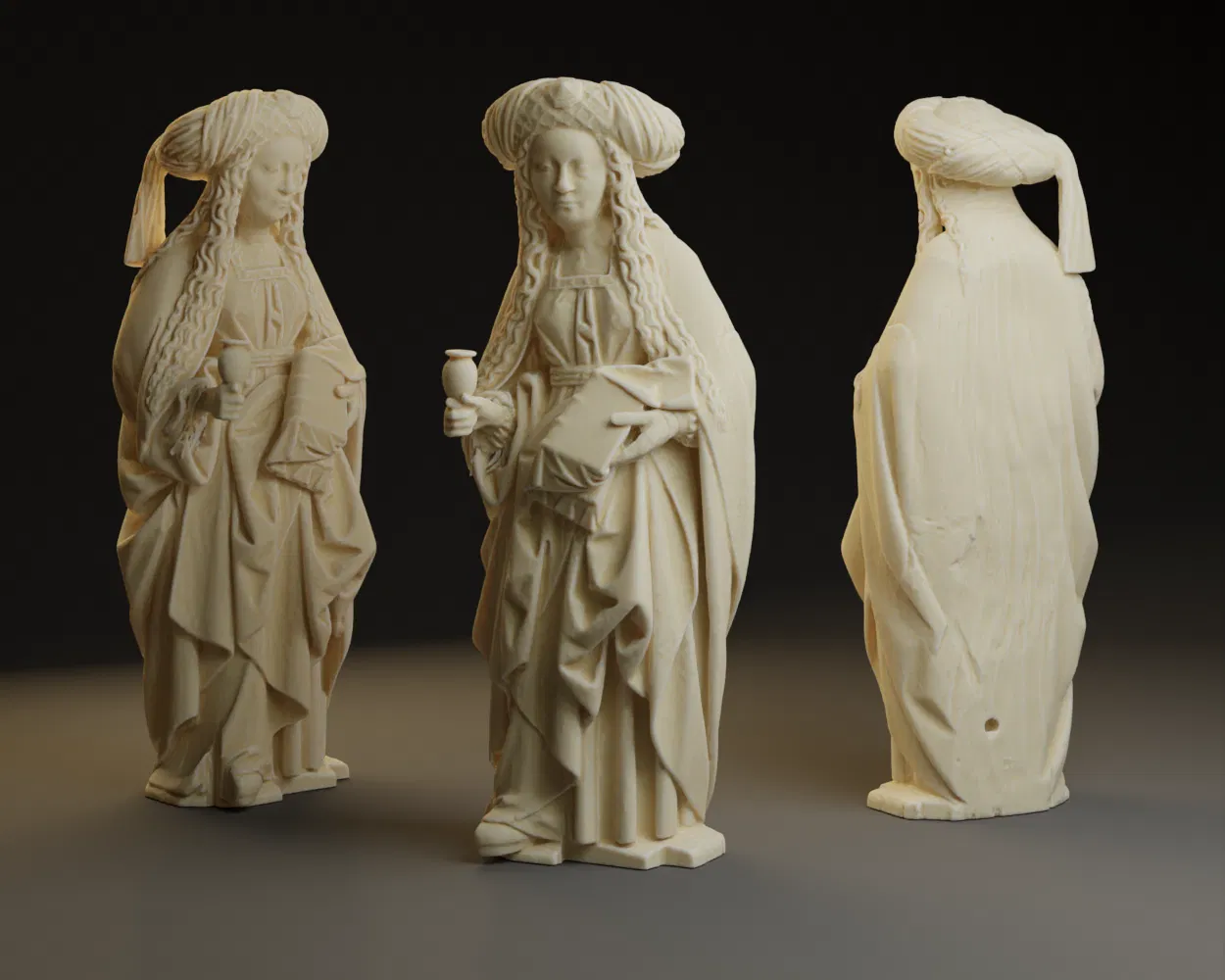 Trong trường hợp mô hình này, bàn tay phải đã bị mất. Có lẽ bà ấy đang cầm một vật dụng để nhận dạng. Sau khi xem xét các đặc điểm nhận dạng khác trên mô hình vị thánh nữ này, chẳng hạn như khăn trùm đầu, mái tóc dài xoăn, và cuốn Kinh Thánh bà ấy đang cầm, việc suy đoán rằng bà ấy có thể là một mô hình của Mary Magdalene là điều không quá khó khăn. Tao đã thêm một chiếc bình ngọc bích vào bàn tay phải đã được sửa của bà ấy. Chiếc bình ngọc bích này theo truyền thống là một biểu tượng/vật dụng gắn liền với Mary Magdalene trong các bức tượng và hình ảnh.