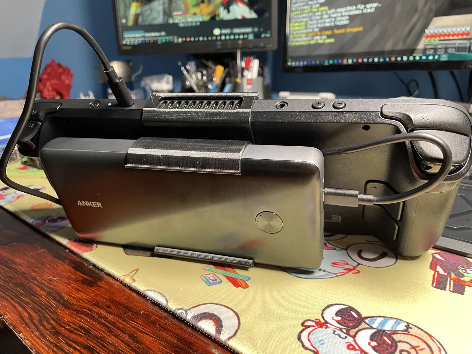 Chân đế kẹp Steam Deck có chỗ để Pin dự phòng Anker PowerCore III Elite 26k 87W. Gắn pin vào trước khi kẹp vào Deck là xong. Nên dùng cáp có góc để có trải nghiệm tốt nhất.