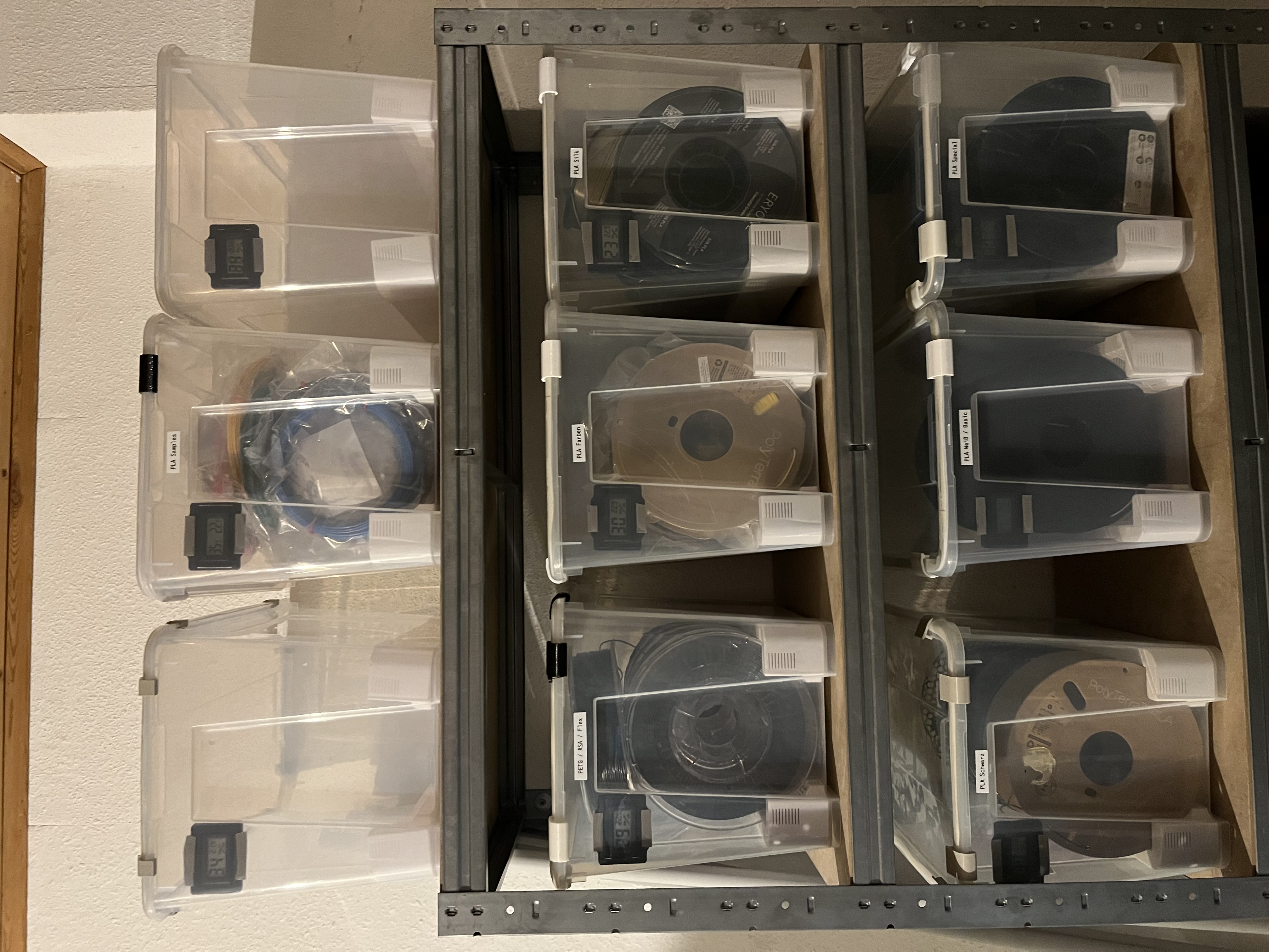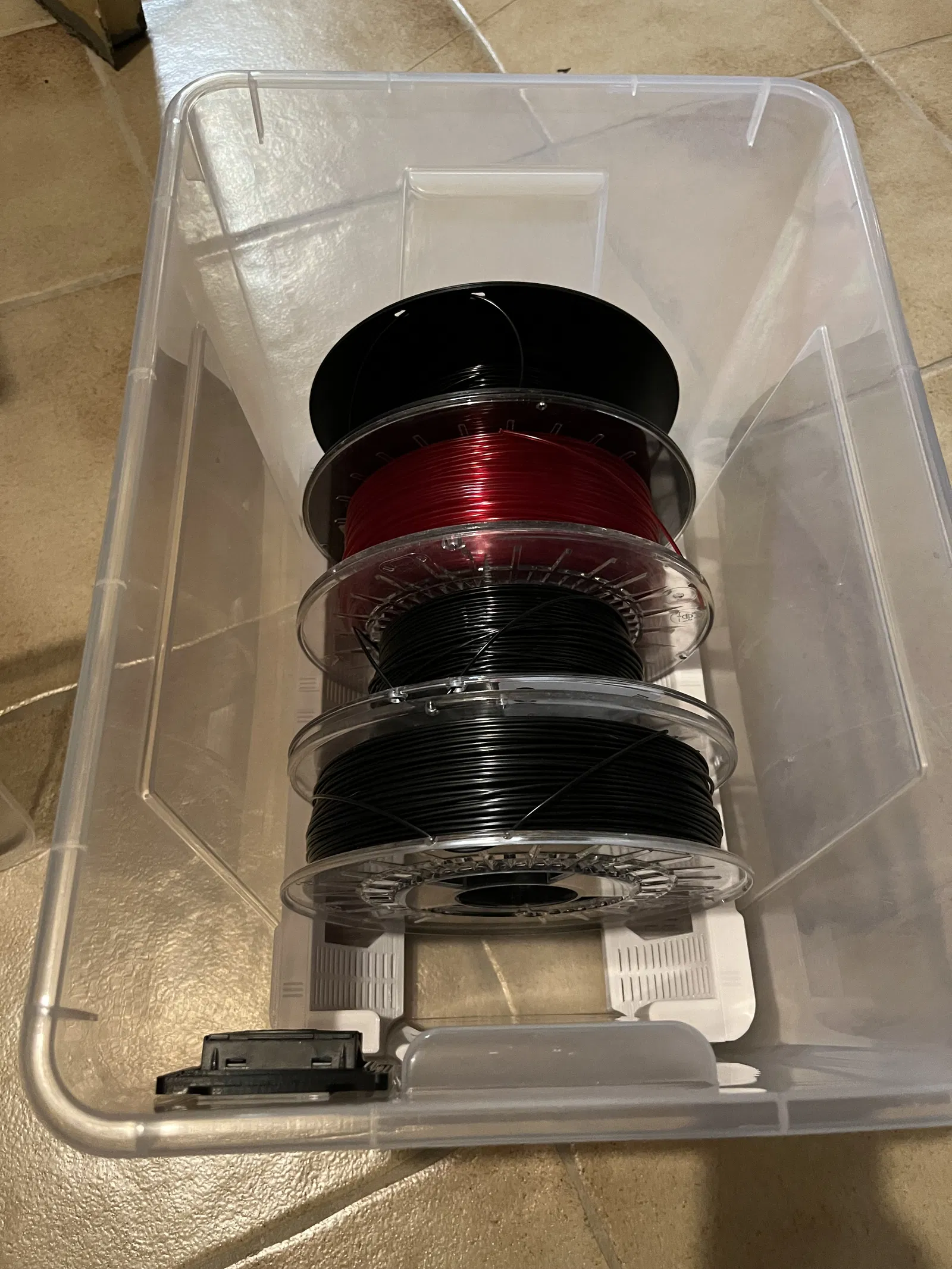 Tao rất thích thiết kế của NOT your favorite engineer. Nó rất chắc chắn và tốn tương đối ít filament so với kích thước của nó. Vì tao có máy XL, nên tao nghĩ sẽ tốt hơn nữa nếu nó được chia làm hai phần thay vì bốn phần cho mỗi hộp. Điều này giúp nó giữ chắc hơn và các cuộn không thể trượt vào giữa các bộ phận. Để làm được điều đó, tao phải thiết kế lại nắp một chút, sao cho nó mở ra bên ngoài. Mô hình của tao tốn khoảng 90g filament cho mỗi bộ phận, tức là 180g cho mỗi hộp. Trên máy XL, mày có thể in tới 5 cái cùng lúc.