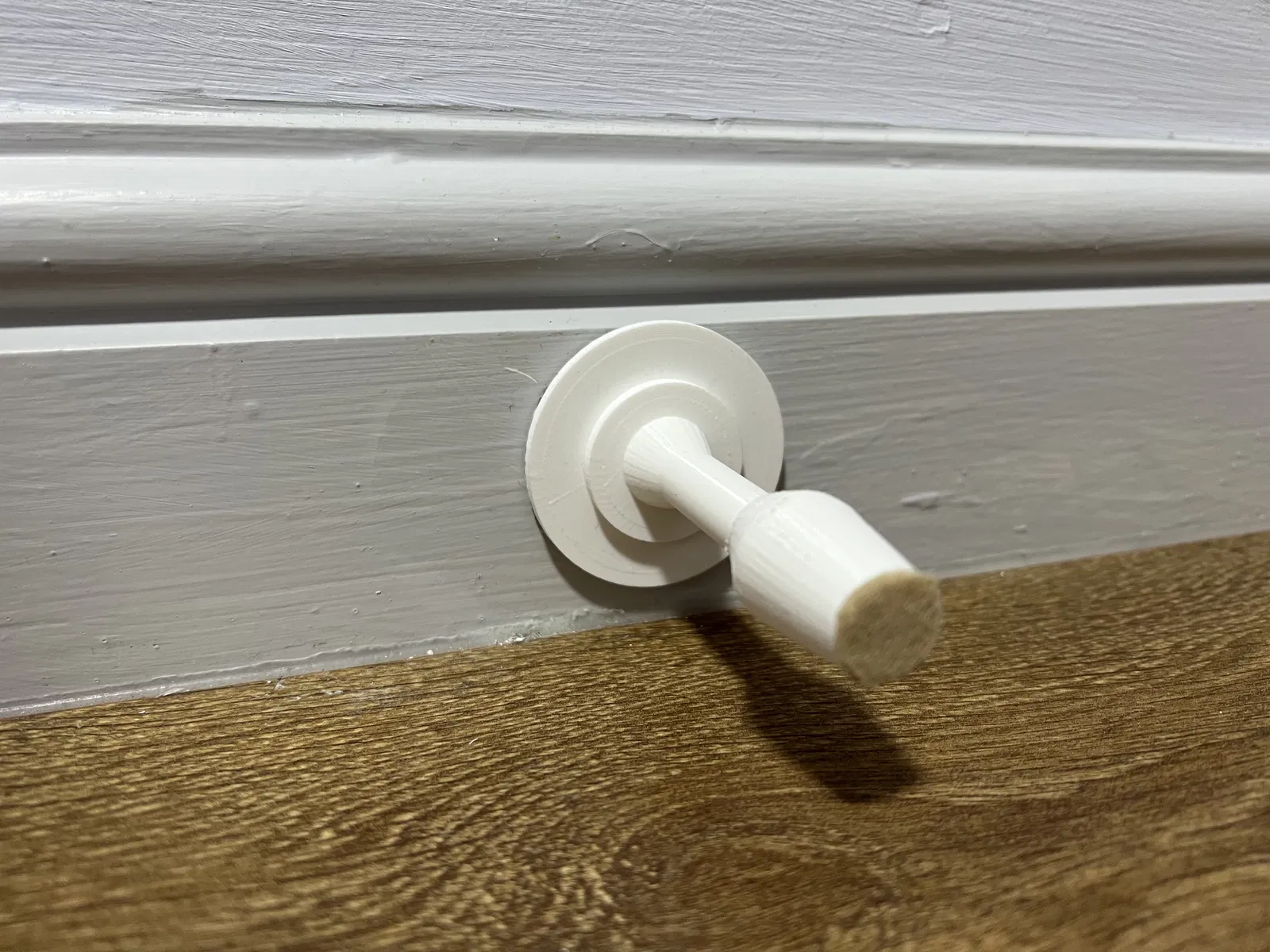 Dùng miếng dán 3M để cố định vào tường/chân tường và một miếng vải nỉ tự dán ở đầu để bảo vệ cửa.