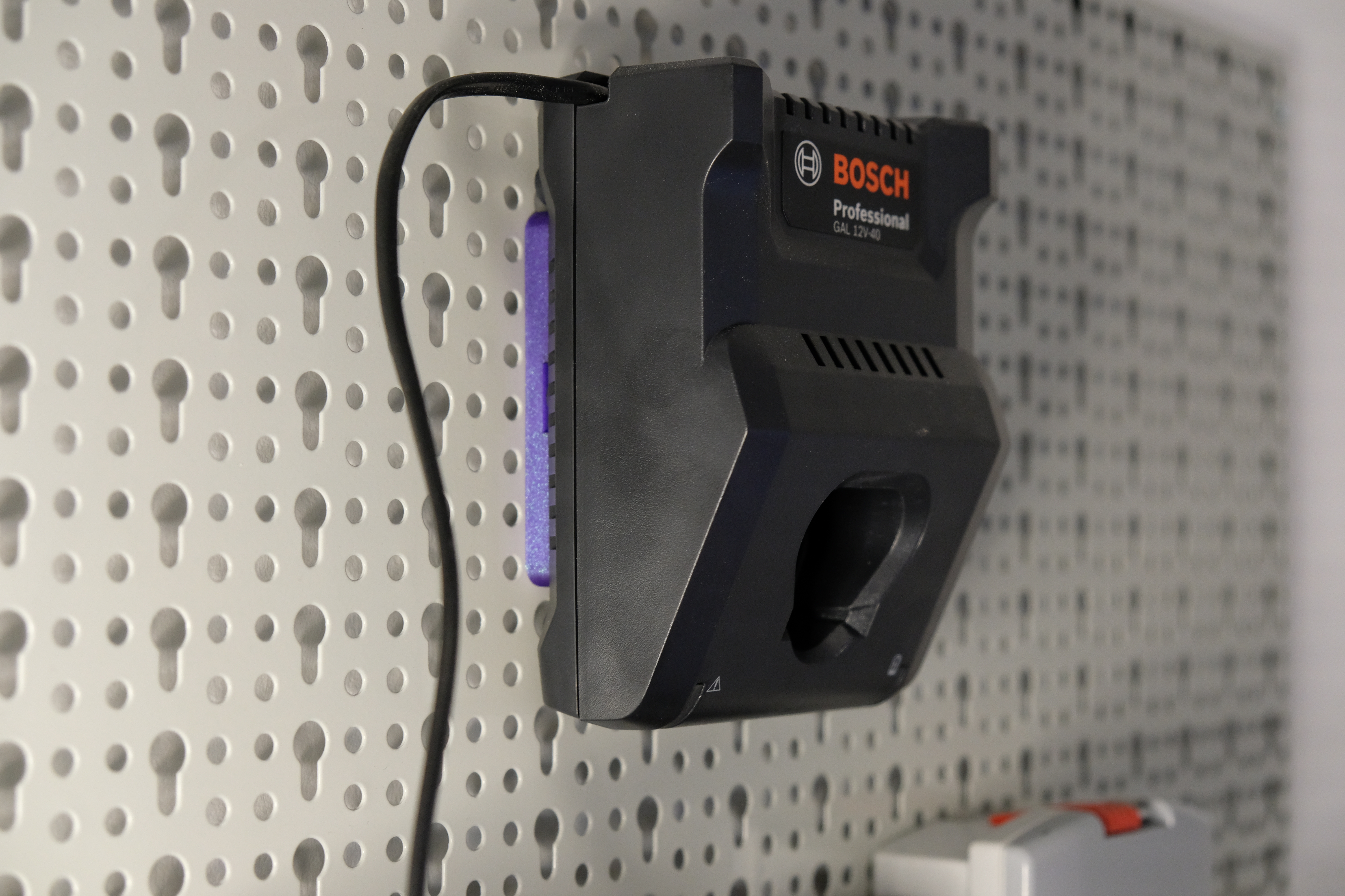 Cái đế giữ sạc Bosch Professional 12 V (GAL 12V-40) cho pegboard chuẩn Châu Âu.