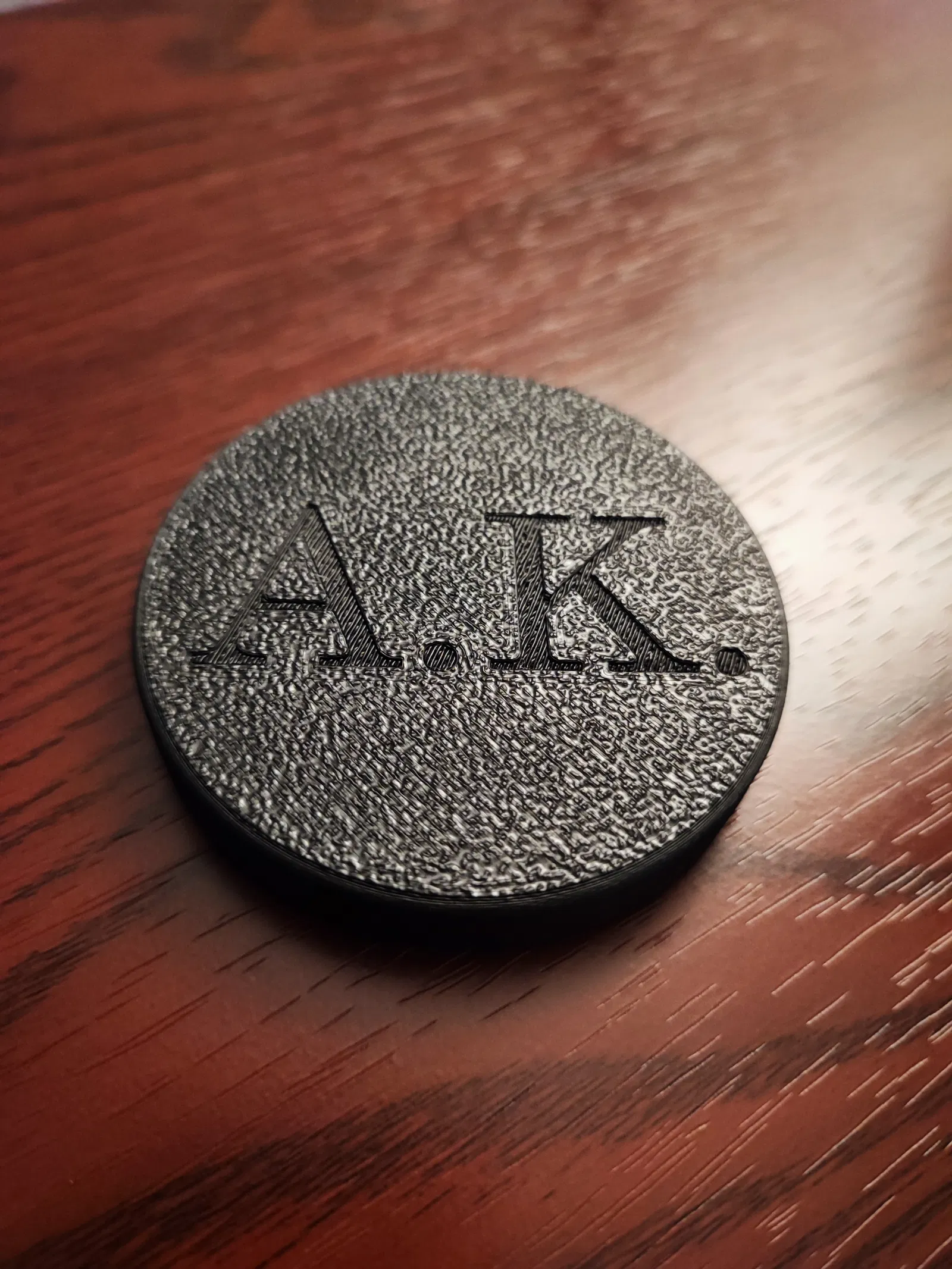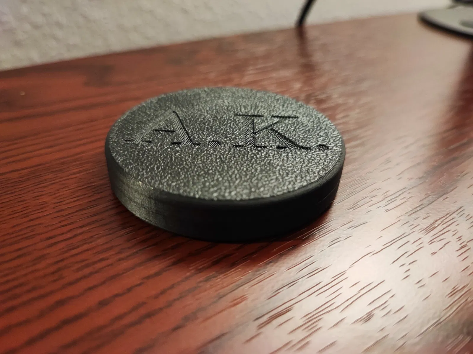 Hộp A.K. nắp vặn, kích thước Ø 67mm, cao 11mm. Lưu ý giảm tốc độ bridging ở phần có chữ. Thời gian in khoảng 2h 22min với độ cao lớp 0.1mm, in bằng PLA.