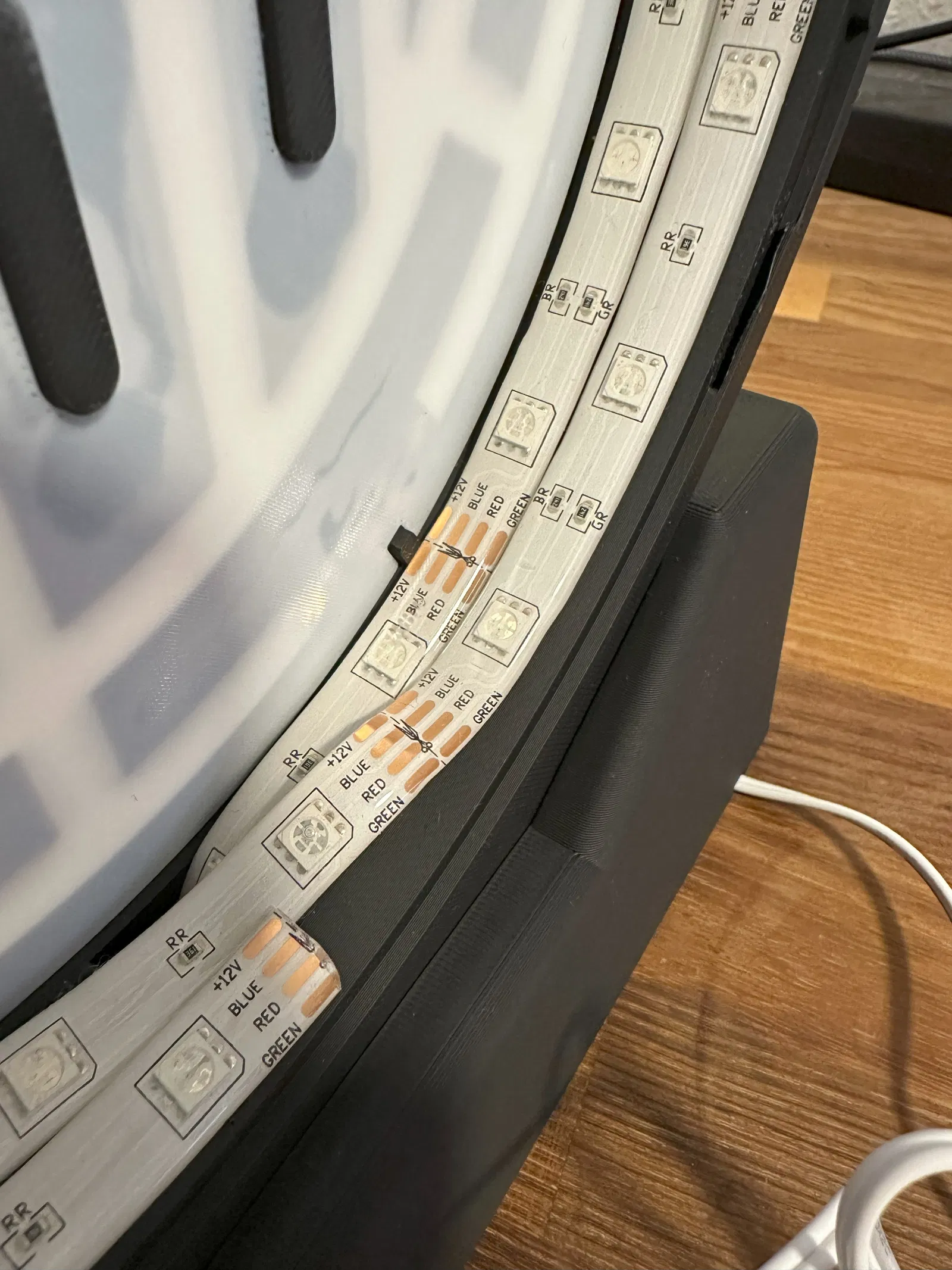 Đầu tiên, tui dán mấy cái bộ phận của cái mặt với cái răng lại với nhau ở cái mặt trước. Dễ ợt hà, nhờ mấy cái lỗ có sẵn khớp với nhau. Tui xài keo siêu dính 502 để làm cái này. Rồi tui dán cái mặt trước vô cái thân đèn cũng bằng keo đó luôn. Sau đó, tui ấn cái thân đèn vô cái đế, chỗ này không cần xài keo đâu. Tiếp theo, tui dán cái dải đèn LED vô trong cái thân đèn bằng cái keo dính sẵn của nó, coi hình 6 nha. Cuối cùng, chỉ cần bắt ốc cái mặt sau vô là xong!